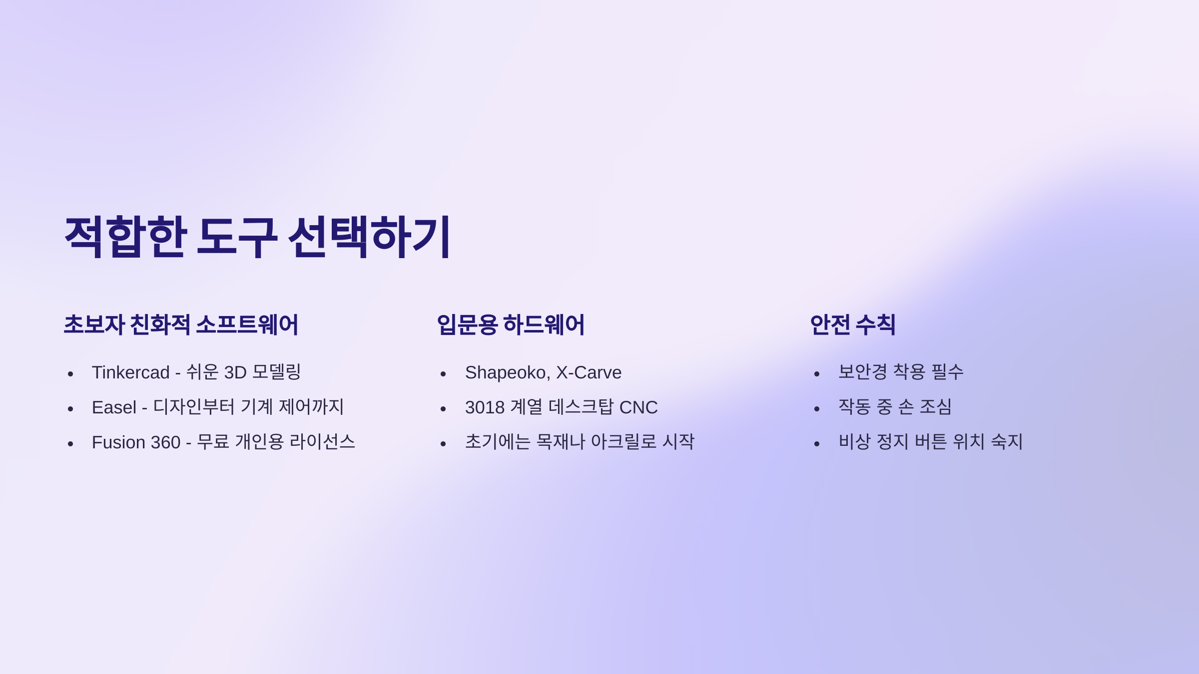 본격적인 커스터마이징을 위해서는 사용하기 쉬운 소프트웨어와 적합한 하드웨어의 선택이 중요합니다. 초보자에게는 직관적인 인터페이스를 가진 CAD/CAM 통합 소프트웨어가 유용합니다. 예를 들어, 웹 기반으로 작동하는 Tinkercad는 매우 쉬운 3D 모델링 환경을 제공하며, Inventables의 Easel이나 Carbide 3D의 Carbide Create 같은 소프트웨어는 디자인부터 CNC 기계 제어까지 비교적 간편하게 수행할 수 있도록 설계되었습니다. 조금 더 전문적인 기능이 필요하다면 Autodesk Fusion 360의 무료 라이선스(취미/개인용)를 활용하는 것도 좋은 방법입니다. 하드웨어 측면에서는 입문용 데스크탑 CNC 라우터(예: Shapeoko, X-Carve, 기타 3018 계열 등)가 비교적 저렴하고 다루기 쉽습니다. 처음에는 가공이 용이한 목재(MDF, 소나무 등)나 아크릴, 플라스틱과 같은 부드러운 재료로 시작하는 것이 좋습니다. 무엇보다 중요한 것은 안전입니다. 반드시 보안경을 착용하고, 기계 작동 중에는 손이나 옷 등이 끼지 않도록 주의하며, 비상 정지 버튼의 위치를 숙지하는 등 안전 수칙을 철저히 지켜야 합니다. 작은 프로젝트부터 차근차근 시도하며 소프트웨어 사용법과 기계 작동 원리를 익혀나가면, 어느새 자신만의 아이디어를 자유롭게 구현하는 즐거움을 만끽하게 될 것입니다.