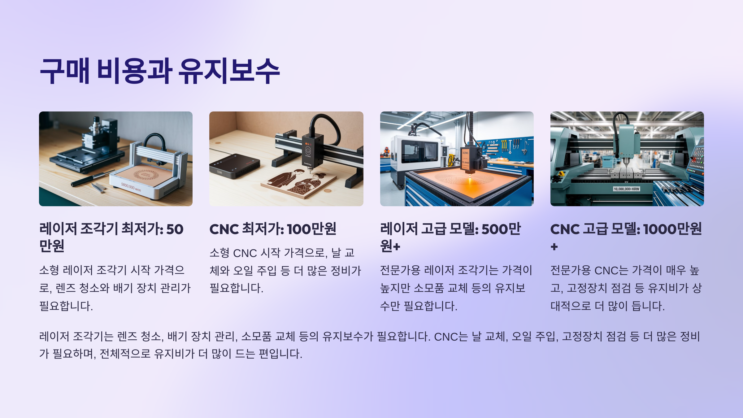 | 레이저 조각기 | 50만 원 ~ 500만 원 이상 | 렌즈 청소, 배기 장치 관리, 소모품 교체 |