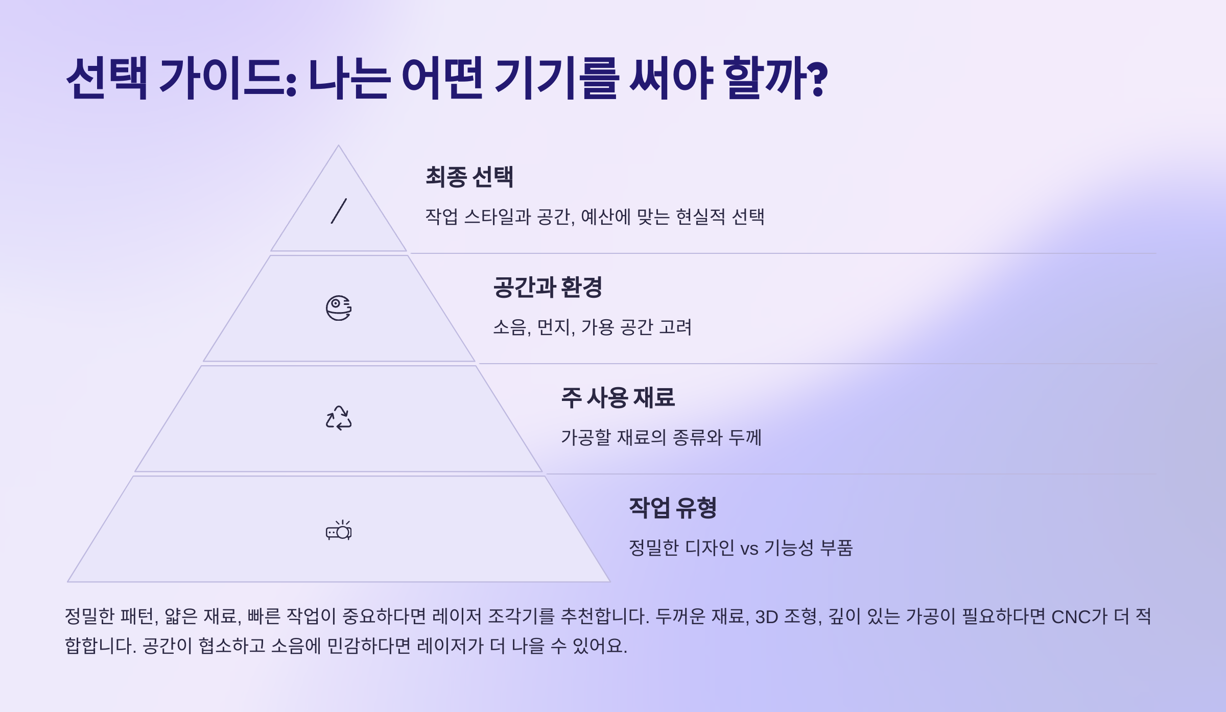 - 두꺼운 재료, 3D 조형, 깊이 있는 가공이 필요하다면? → CNC 추천