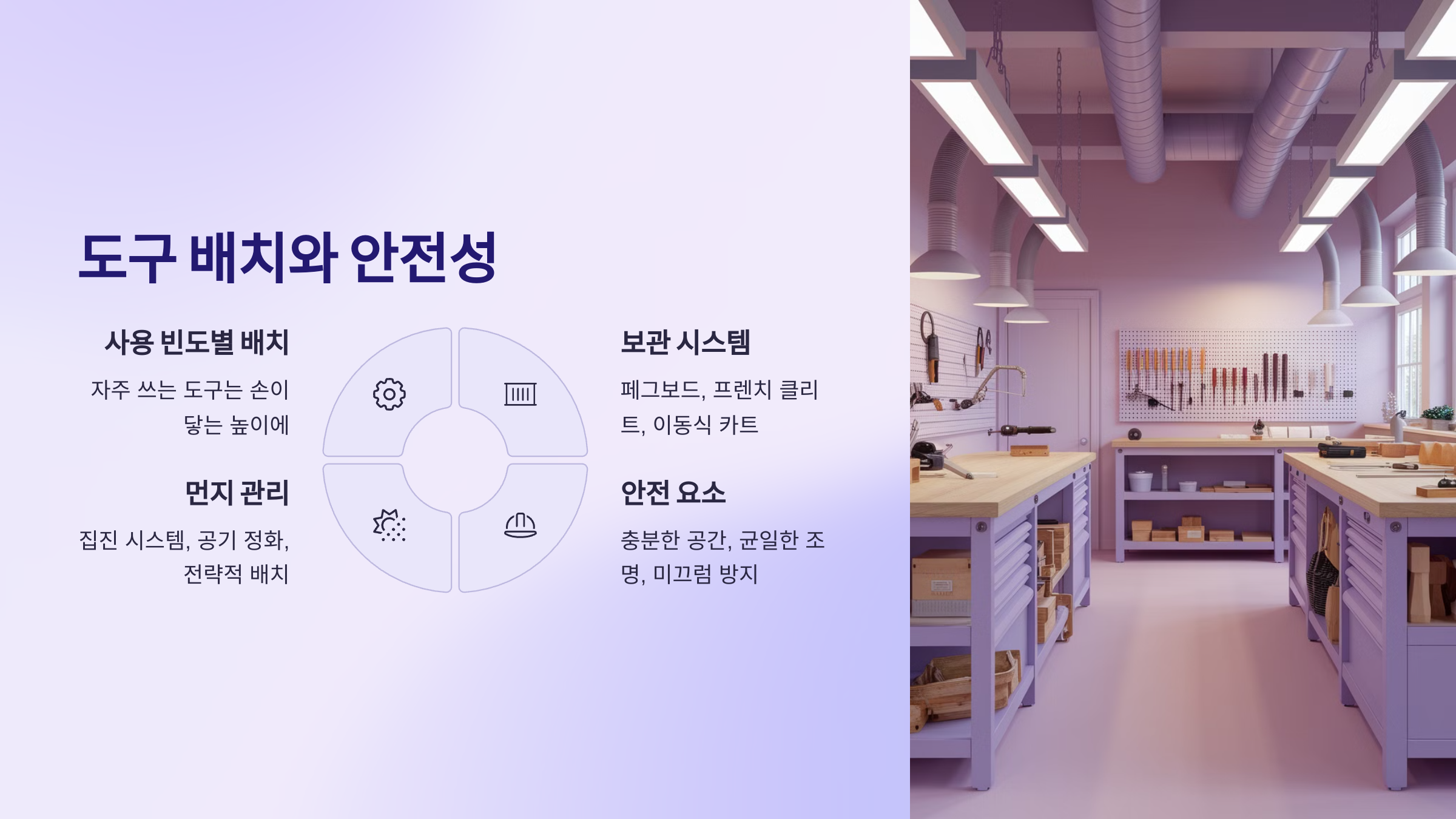 - 수공구 작업 구역: 워크벤치를 중심으로 한 정밀 작업 공간