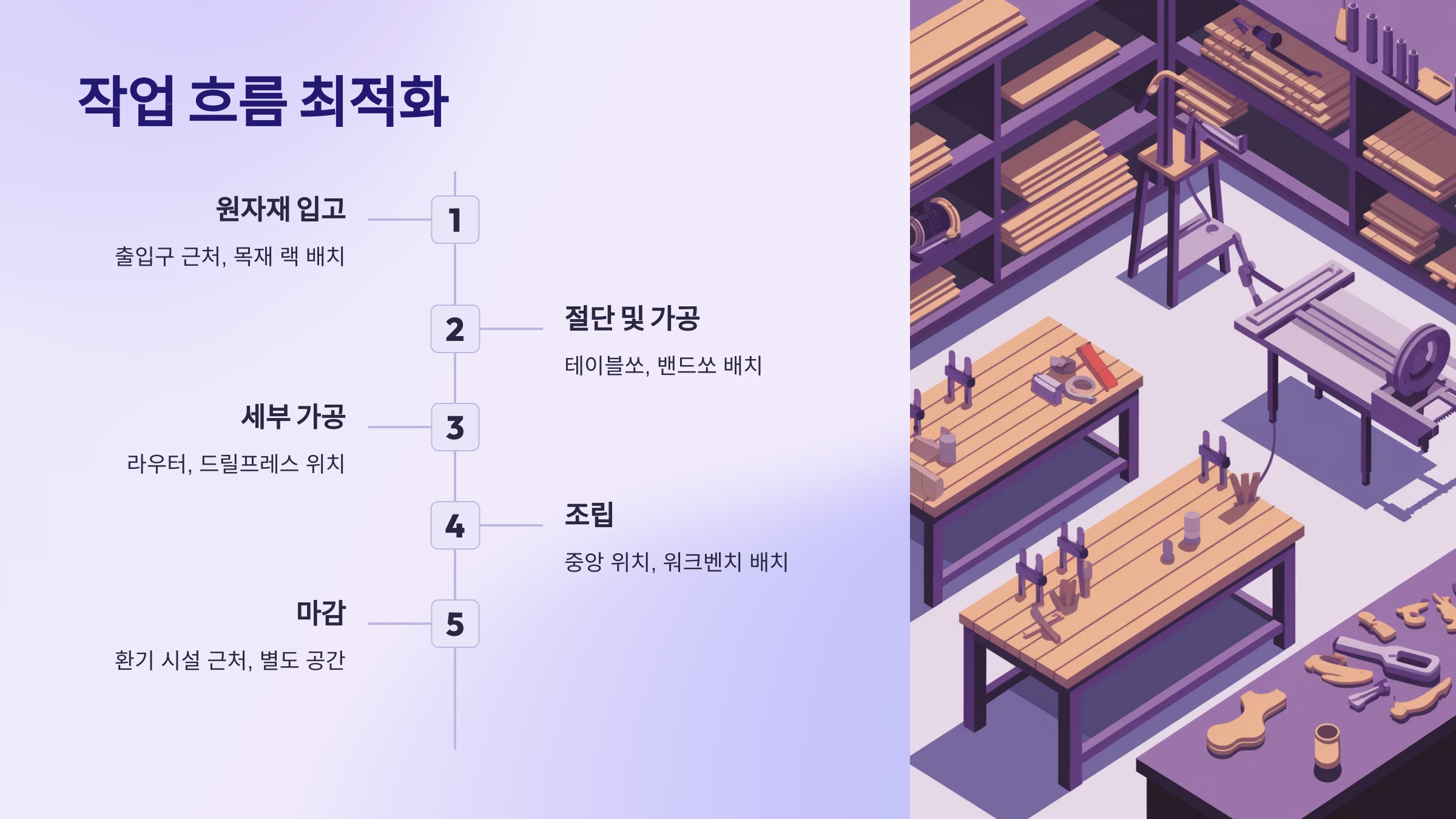 효율적인 작업 흐름은 공방 생산성의 핵심입니다. 이상적인 목공 작업 흐름은 원자재 입고부터 완제품 출고까지 일직선 또는 U자형 동선을 따르는 것이 좋습니다. 이를 통해 불필요한 이동과 시간 낭비를 줄일 수 있어요.