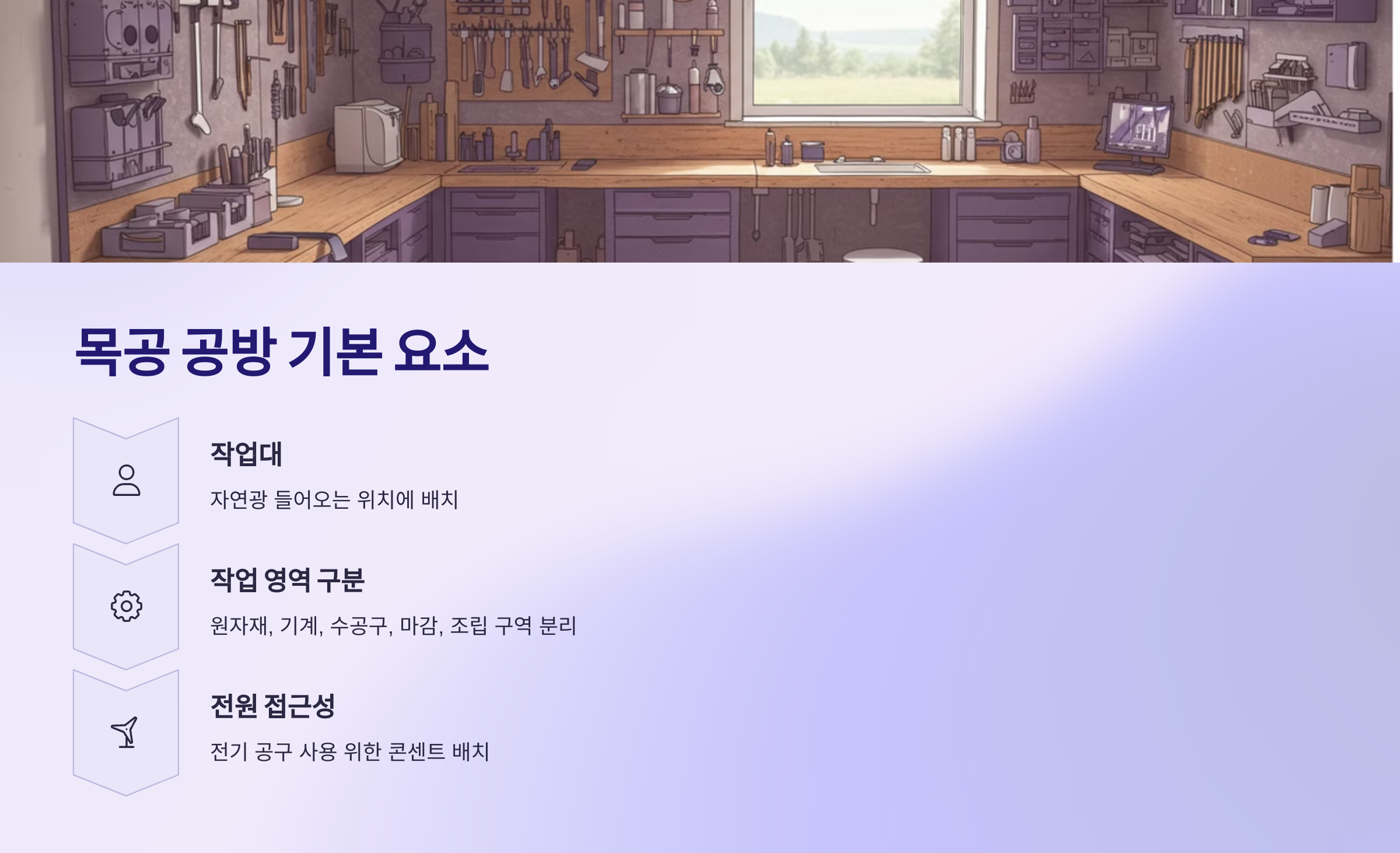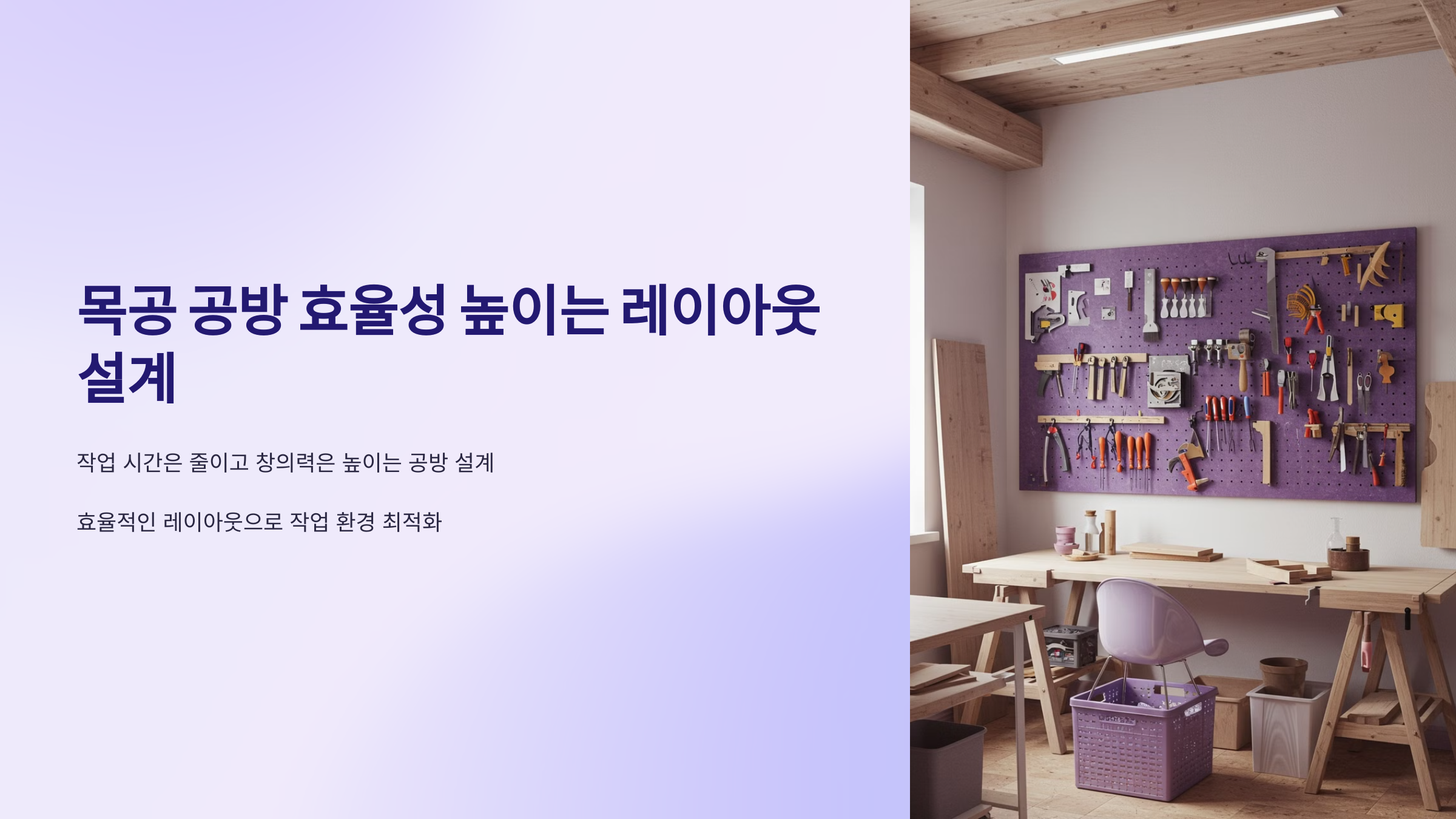 안녕하세요, 목공 애호가 여러분. 새로운 작품을 만들 때 가장 큰 고민 중 하나가 바로 '효율성'이죠. 아무리 좋은 아이디어와 기술이 있어도, 작업 환경이 제대로 갖춰져 있지 않으면 시간도 많이 소요되고 품질도 떨어질 수 있어요. 저도 처음 공방을 차릴 때 이 문제로 많은 시행착오를 겪었답니다. 오늘은 제가 수년간의 경험을 통해 알게 된 목공 공방 레이아웃의 핵심 원리와 효율성을 극대화하는 방법을 소개해 드릴게요. 이 글을 통해 여러분의 작업 공간이 더 효율적이고 창의적인 공간으로 거듭나길 바랍니다!
