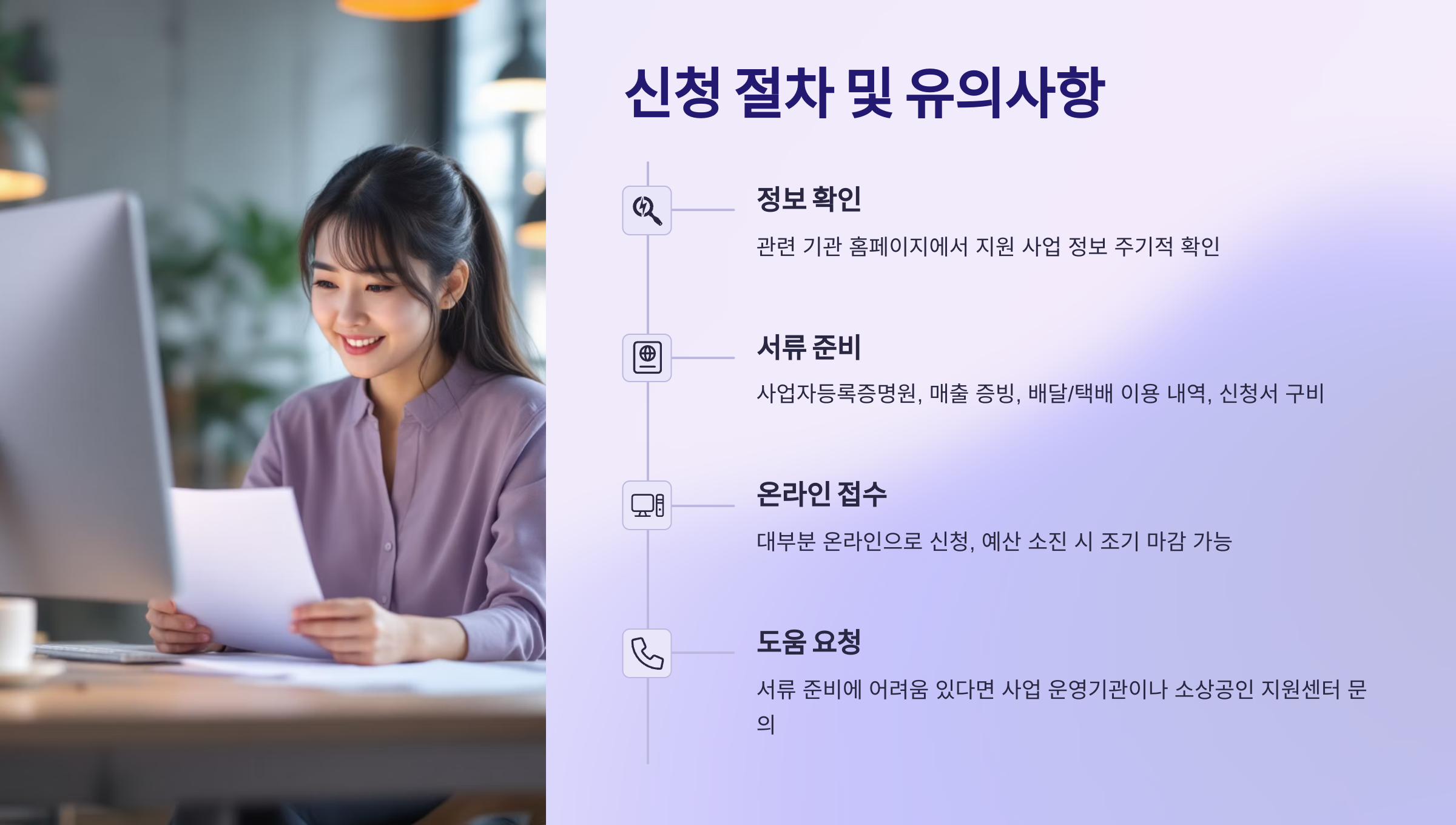 이러한 지원 사업에 대한 정보는 주로 소상공인시장진흥공단(SEMAS) 홈페이지나 중소벤처기업부(MSS) 관련 사이트, 그리고 각 지방자치단체(시, 군, 구청) 홈페이지의 공지사항이나 기업지원 섹션에서 찾아볼 수 있습니다. 또한, K-스타트업(k-startup.go.kr)과 같은 창업 및 기업 지원 포털에서도 관련 정보를 통합적으로 제공하는 경우가 많습니다. 신청 절차는 대개 온라인 접수를 기본으로 하며, 사업자등록증명원, 매출 증빙 서류, 실제 배달/택배 이용 내역(영수증 등), 지원 신청서 등을 구비하여 제출하는 방식입니다. 사업별로 신청 기간이 정해져 있고 예산 소진 시 조기 마감될 수 있으므로, 관심을 두고 주기적으로 관련 정보를 확인하고 공고가 뜨면 신속하게 준비하여 신청하는 것이 중요합니다. 서류 준비에 어려움을 느낀다면 각 사업 운영기관의 문의처나 소상공인 지원센터 등의 도움을 받는 것도 좋은 방법입니다. 이러한 지원 제도를 적극적으로 활용하여 물류비 부담을 줄이고 온라인 시장에서의 경쟁력을 높이는 기회로 삼으시길 바랍니다.