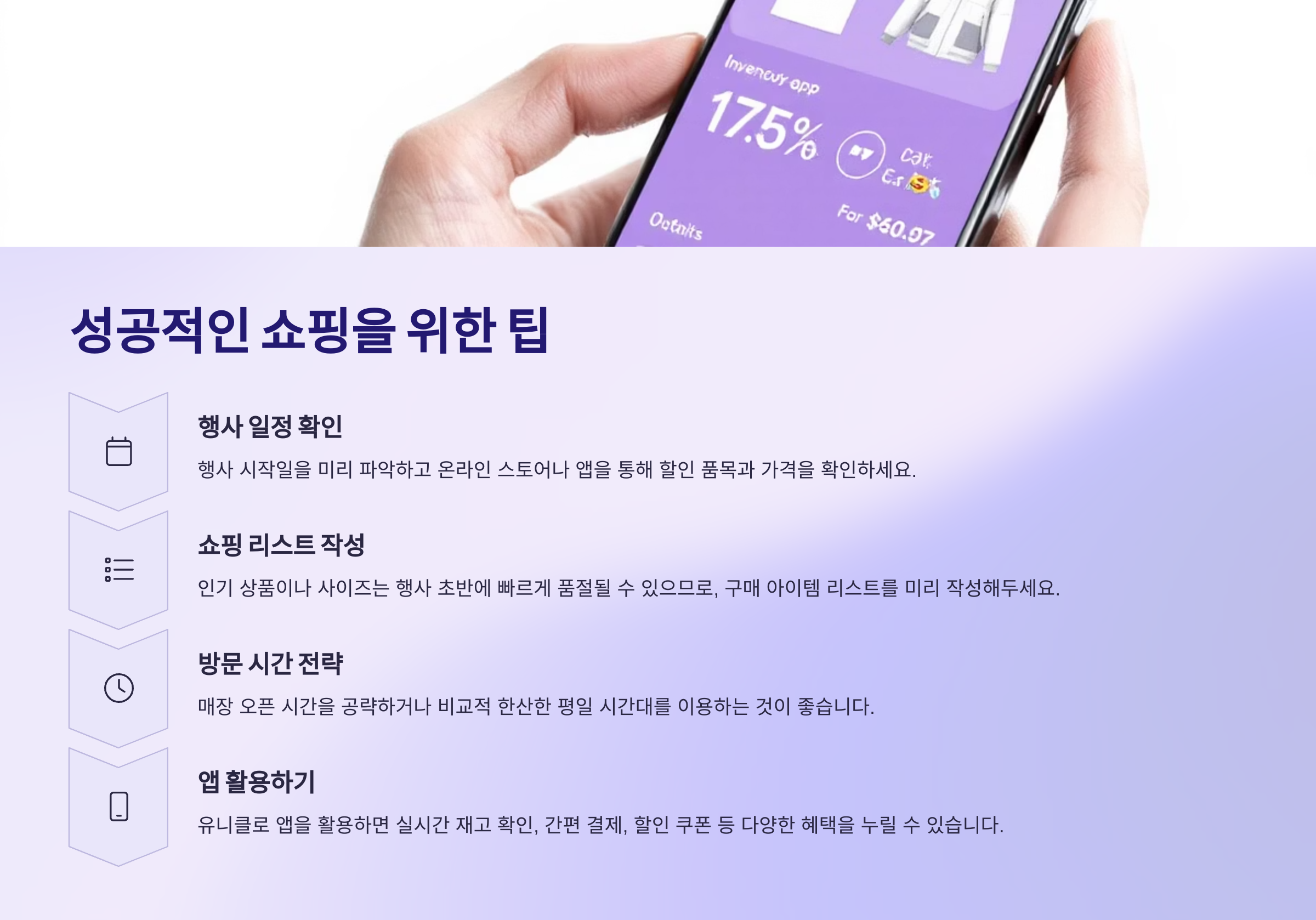 유니클로 여름 감사제의 혜택을 최대한 누리기 위해서는 사전 준비와 전략적인 접근이 필요합니다. 먼저, 행사 시작 전 유니클로 공식 온라인 스토어나 앱을 통해 할인 대상 품목, 할인율, 행사 기간 등의 세부 정보를 미리 확인하는 것이 필수입니다. 이를 바탕으로 자신에게 필요한 아이템의 우선순위를 정하고 쇼핑 리스트를 작성해두면 충동구매를 막고 효율적인 쇼핑이 가능합니다. 온라인 스토어를 이용하면 매장의 혼잡함을 피하고 재고 상황을 실시간으로 확인하며 편리하게 구매할 수 있습니다. 특히 온라인 구매 시에는 평소 자신의 사이즈를 정확히 파악하고, 상품 페이지의 상세 사이즈표를 꼼꼼히 확인하는 것이 실패 확률을 줄이는 방법입니다. 오프라인 매장을 방문할 계획이라면, 비교적 덜 붐비는 평일 오전 시간대나 행사 초반을 노리는 것이 좋습니다. 인기 상품은 조기에 품절될 수 있으며, 계산대 줄이 길어질 수 있기 때문입니다. 유니클로 앱을 미리 설치하여 실시간 재고 확인, 간편 결제, 앱 회원 전용 특별 가격 혜택이나 쿠폰 등을 활용하는 것도 스마트한 쇼핑 방법 중 하나입니다. 철저한 준비로 알찬 쇼핑을 즐기시길 바랍니다.