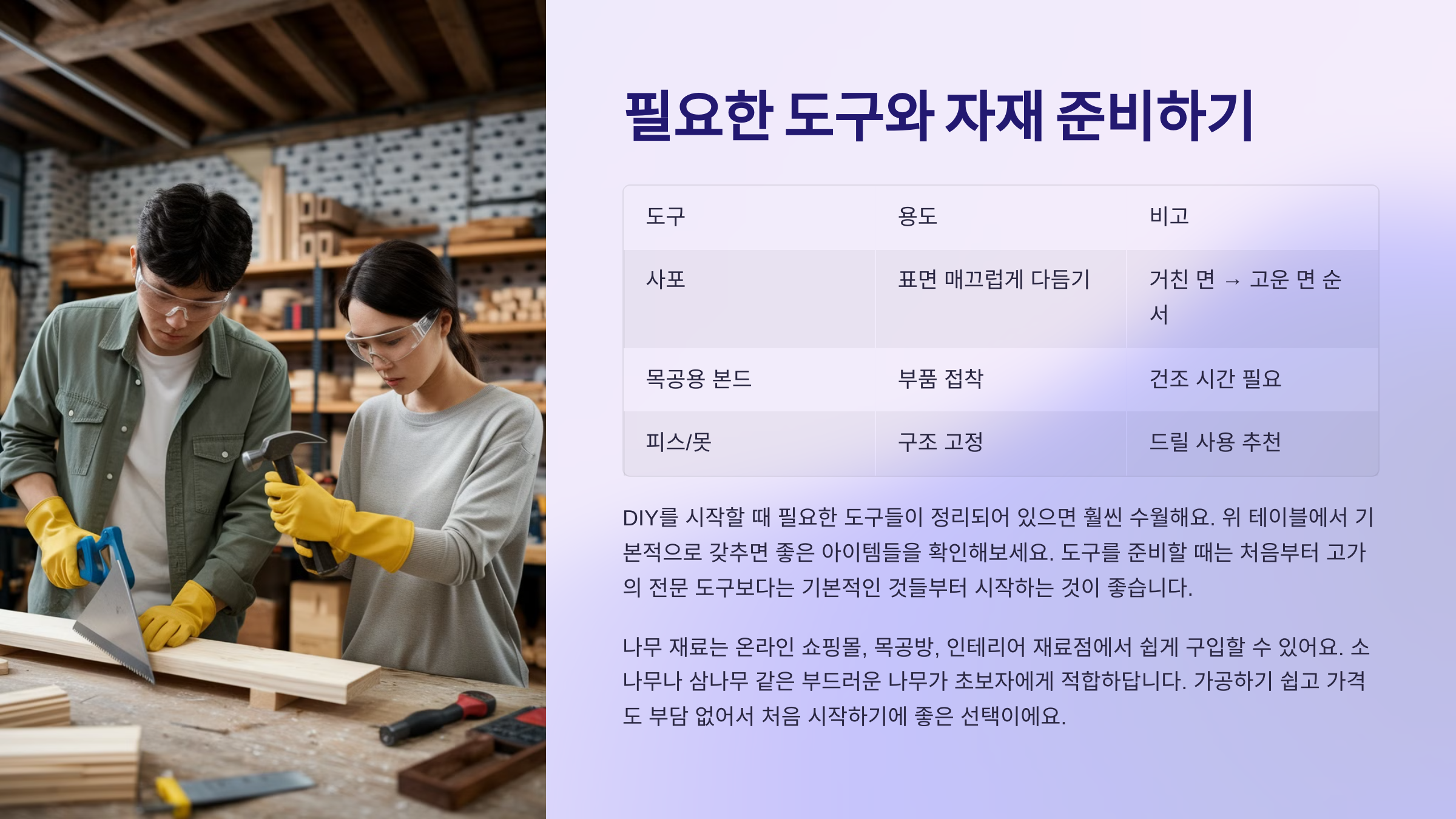 소나무나 삼나무 같은 부드러운 나무가 초보자에게 좋아요. 가공하기 쉽고 가격도 부담 없답니다.