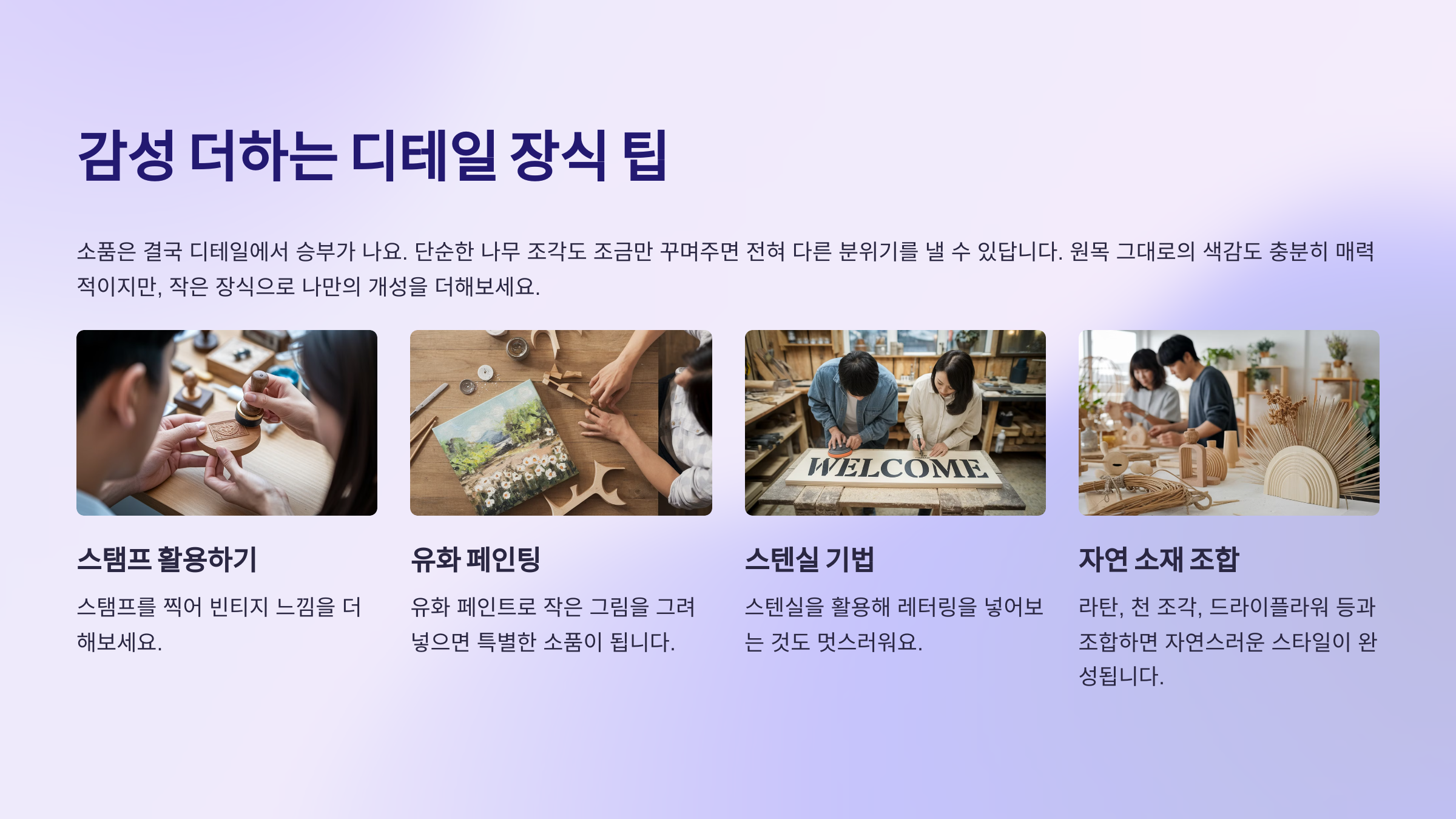 소품은 결국 디테일에서 승부가 나요. 단순한 나무 조각도 조금만 꾸며주면 전혀 다른 분위기를 낼 수 있답니다. 예를 들어 스탬프를 찍어 빈티지 느낌을 더한다거나, 유화 페인트로 작은 그림을 그려 넣는 것도 좋아요. 스텐실 기법을 활용해 레터링을 넣어보는 것도 멋스럽고요.