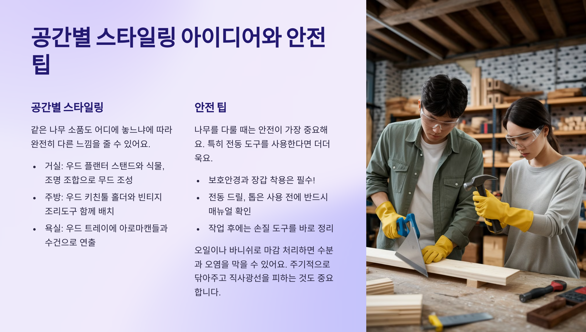 같은 나무 소품도 어디에 놓느냐에 따라 완전히 다른 느낌을 줄 수 있어요. 공간별로 어울리는 스타일링 아이디어를 아래에 정리해봤어요.