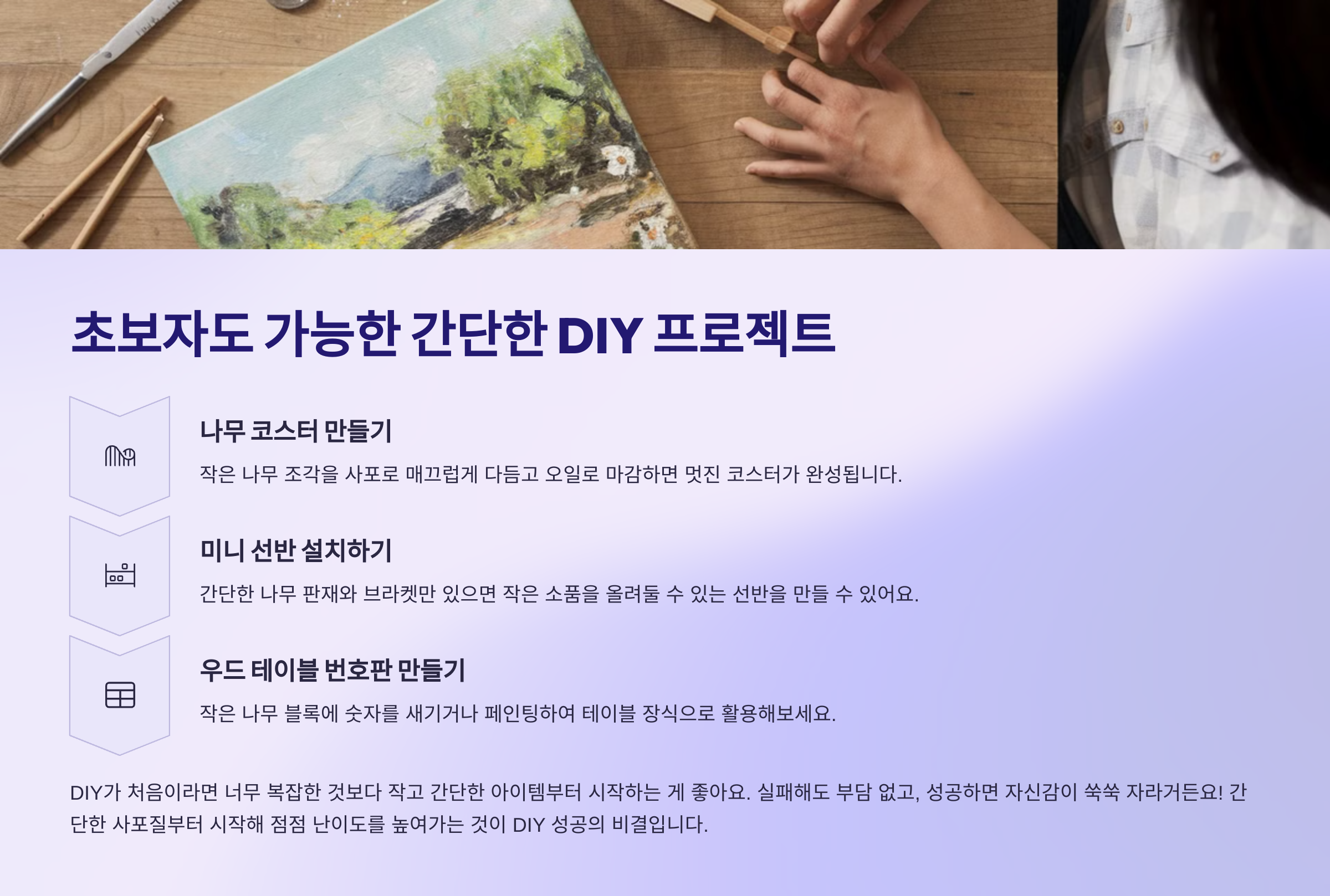 물론이죠! 간단한 사포질부터 시작해보세요. 나무 코스터나 미니 트레이는 손쉽게 도전할 수 있어요.