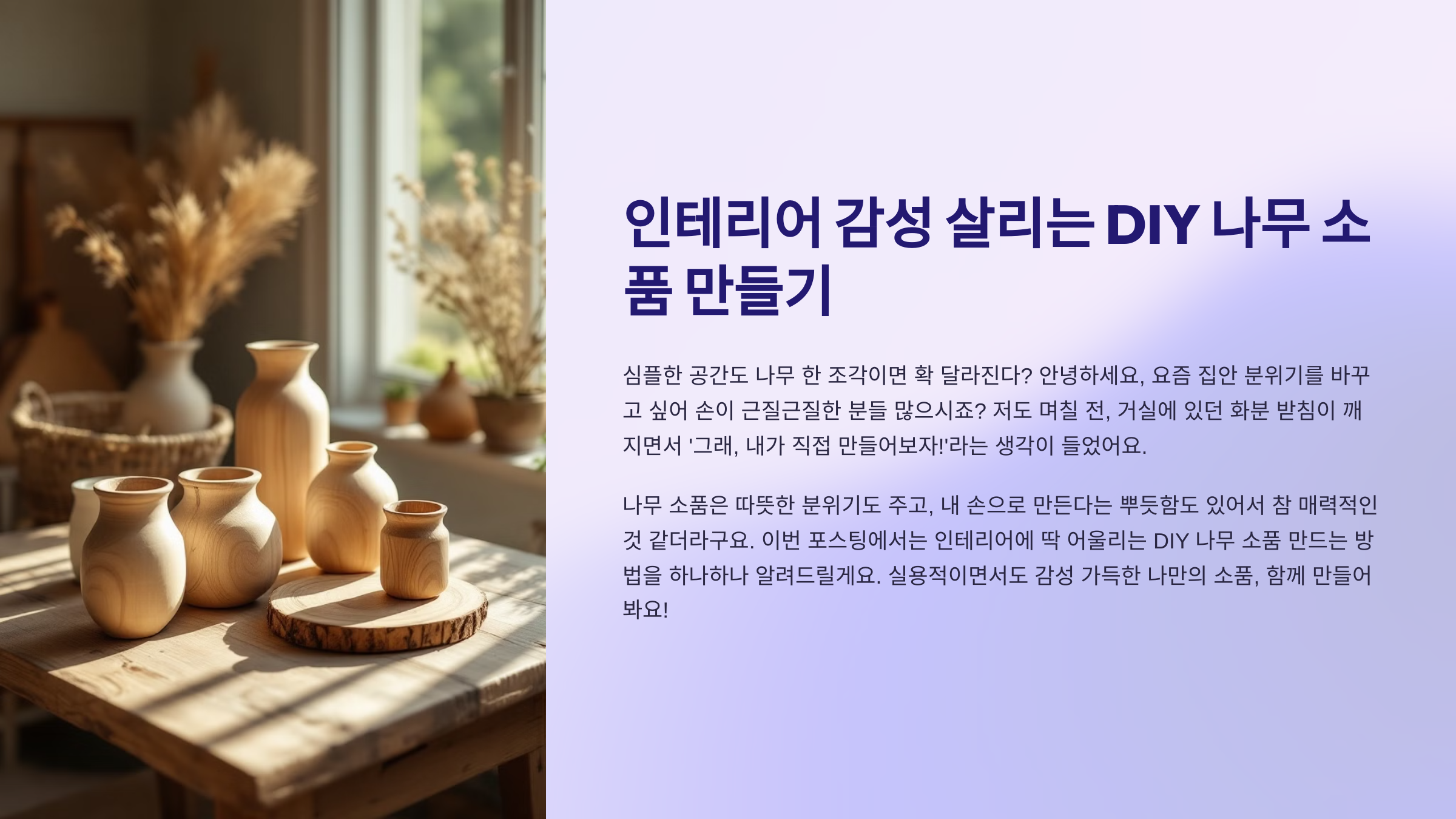 안녕하세요, 요즘 집안 분위기를 바꾸고 싶어 손이 근질근질한 분들 많으시죠? 저도 며칠 전, 거실에 있던 화분 받침이 깨지면서 ‘그래, 내가 직접 만들어보자!’라는 생각이 들었어요. 그러고 보니, 나무 소품은 따뜻한 분위기도 주고, 내 손으로 만든다는 뿌듯함도 있어서 참 매력적인 것 같더라구요. 이번 포스팅에서는 인테리어에 딱 어울리는 DIY 나무 소품 만드는 방법을 하나하나 알려드릴게요. 실용적이면서도 감성 가득한 나만의 소품, 함께 만들어봐요!