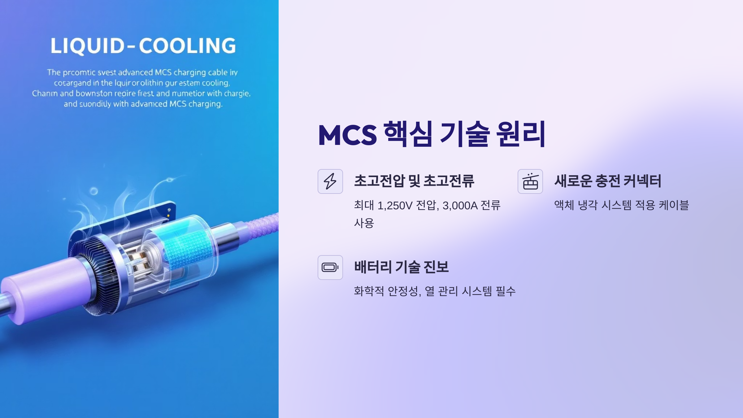 MCS가 이처럼 압도적인 충전 속도를 낼 수 있는 비결은 단순히 전력량만 높인 것이 아니라, 관련된 모든 기술 요소가 함께 발전했기 때문입니다.