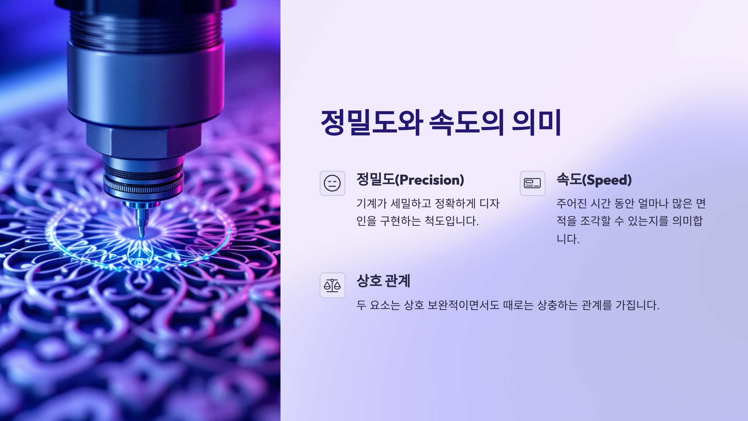반면, 속도(Speed)는 주어진 시간 동안 얼마나 많은 면적을 조각하거나 작업을 완료할 수 있는지를 의미하며, 생산성과 직접적인 관련이 있습니다.