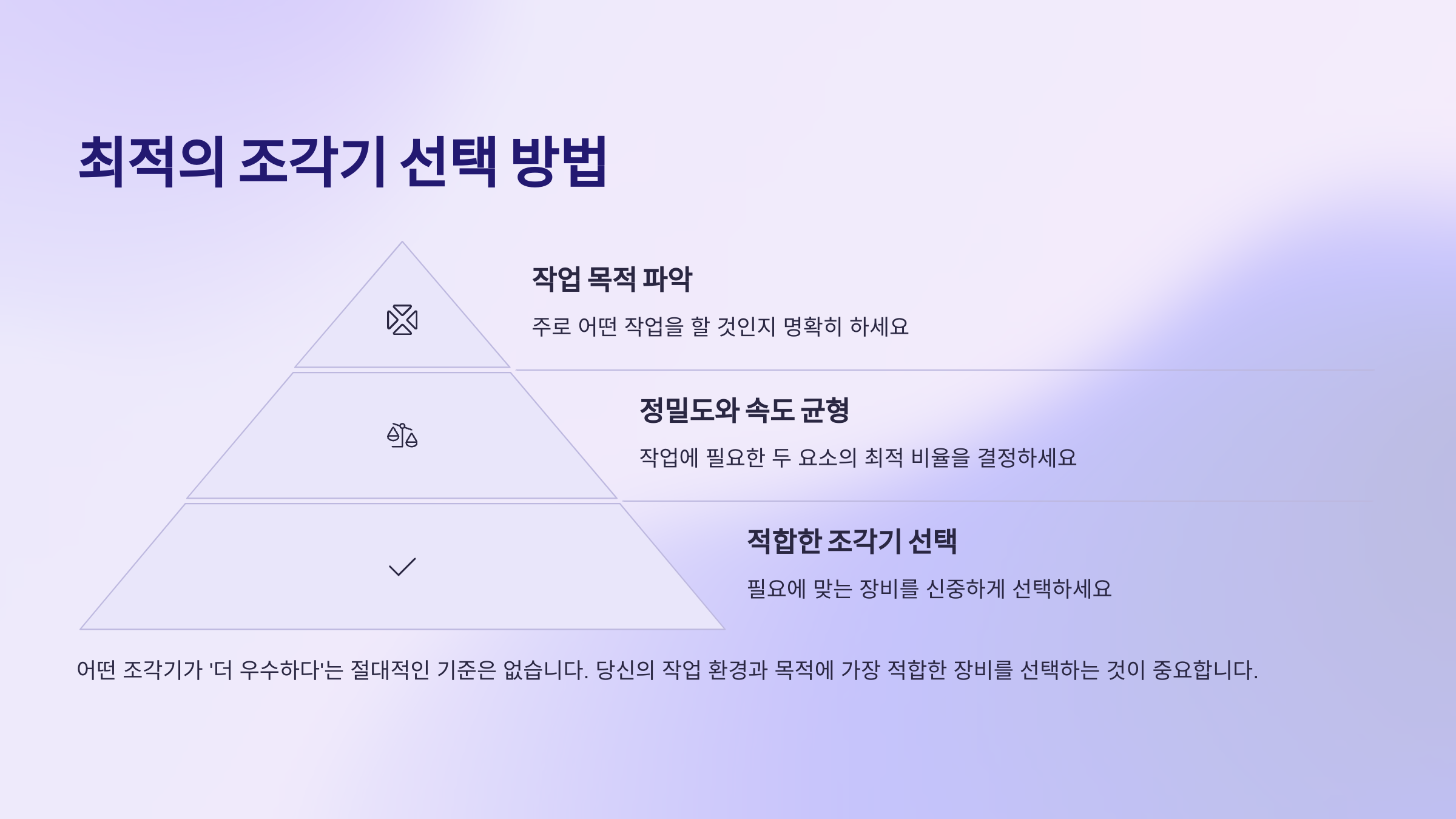 이처럼 어떤 조각기가 '더 우수하다'는 절대적인 기준은 없습니다. 중요한 것은 당신이 주로 작업할 내용과 환경을 정확히 파악하고, 정밀도와 속도라는 두 가지 핵심 요소를 기준으로 가장 적합한 조각기를 신중하게 선택하는 것입니다. 때로는 정밀도를 약간 양보하여 생산성을 높이는 것이, 때로는 시간이 더 걸리더라도 완벽한 결과물을 추구하는 것이 현명한 결정일 수 있습니다.