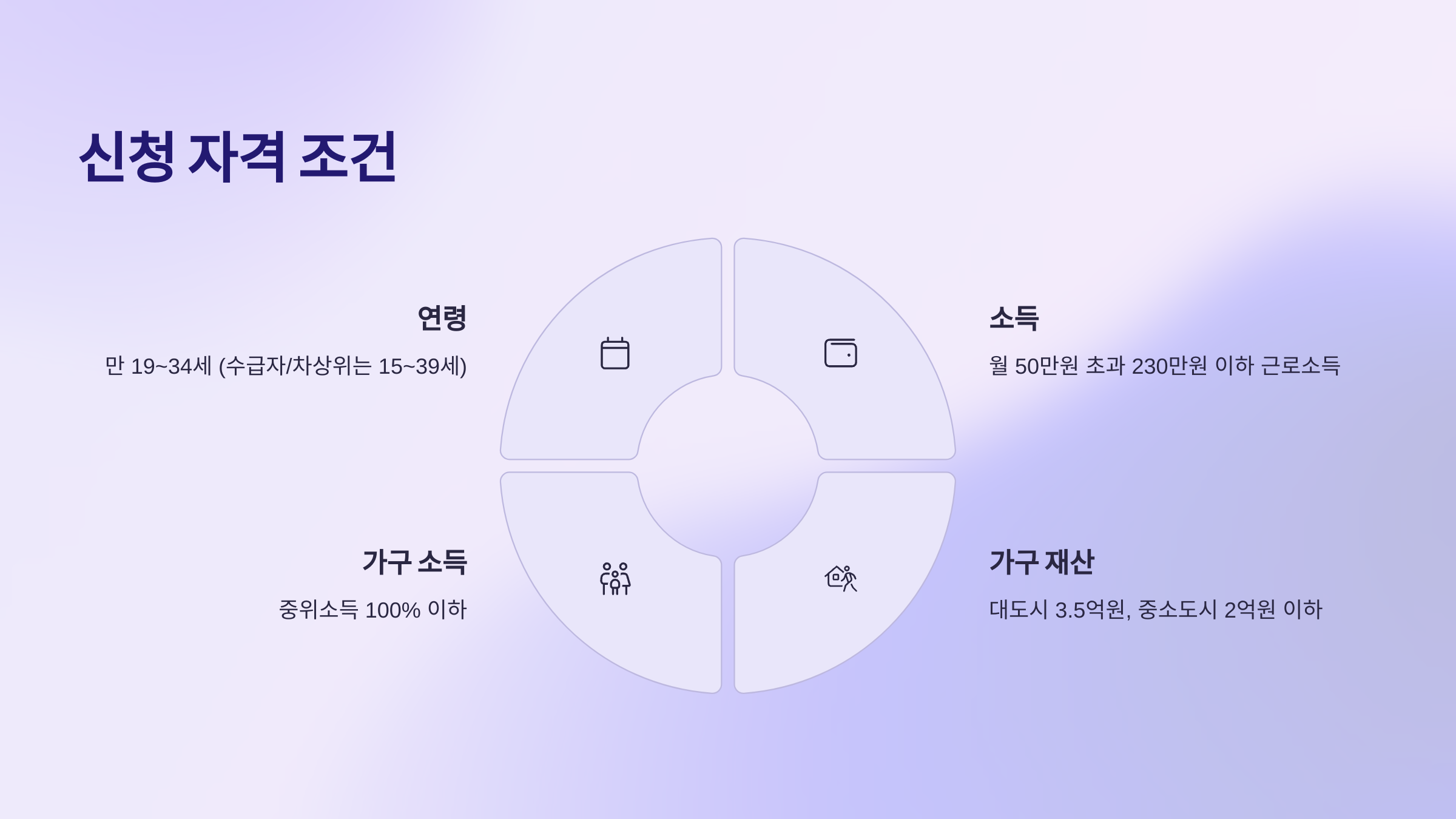 셋째, 가구 소득 및 재산 기준입니다. 청년 본인뿐만 아니라, 청년이 속한 가구의 소득이 기준 중위소득 100% 이하여야 합니다. 또한, 가구 재산 역시 대도시 기준 3.5억 원, 중소도시 2억 원, 농어촌 1.7억 원 이하 등의 상한선이 있습니다. (이 기준액은 매년 변동)