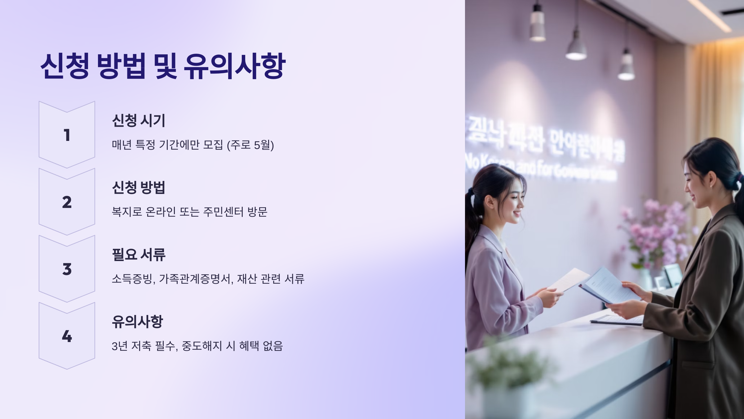 넷째, 중복 참여 제한입니다. 정부나 지자체에서 시행하는 유사한 자산형성지원사업(예: 청년희망키움통장, 청년저축계좌 등 일부 사업)에 이미 참여하고 있거나 과거에 혜택을 받은 경우 신청이 제한될 수 있습니다. 따라서 기존에 참여 중인 제도가 있다면 중복 가능 여부를 확인해야 합니다.