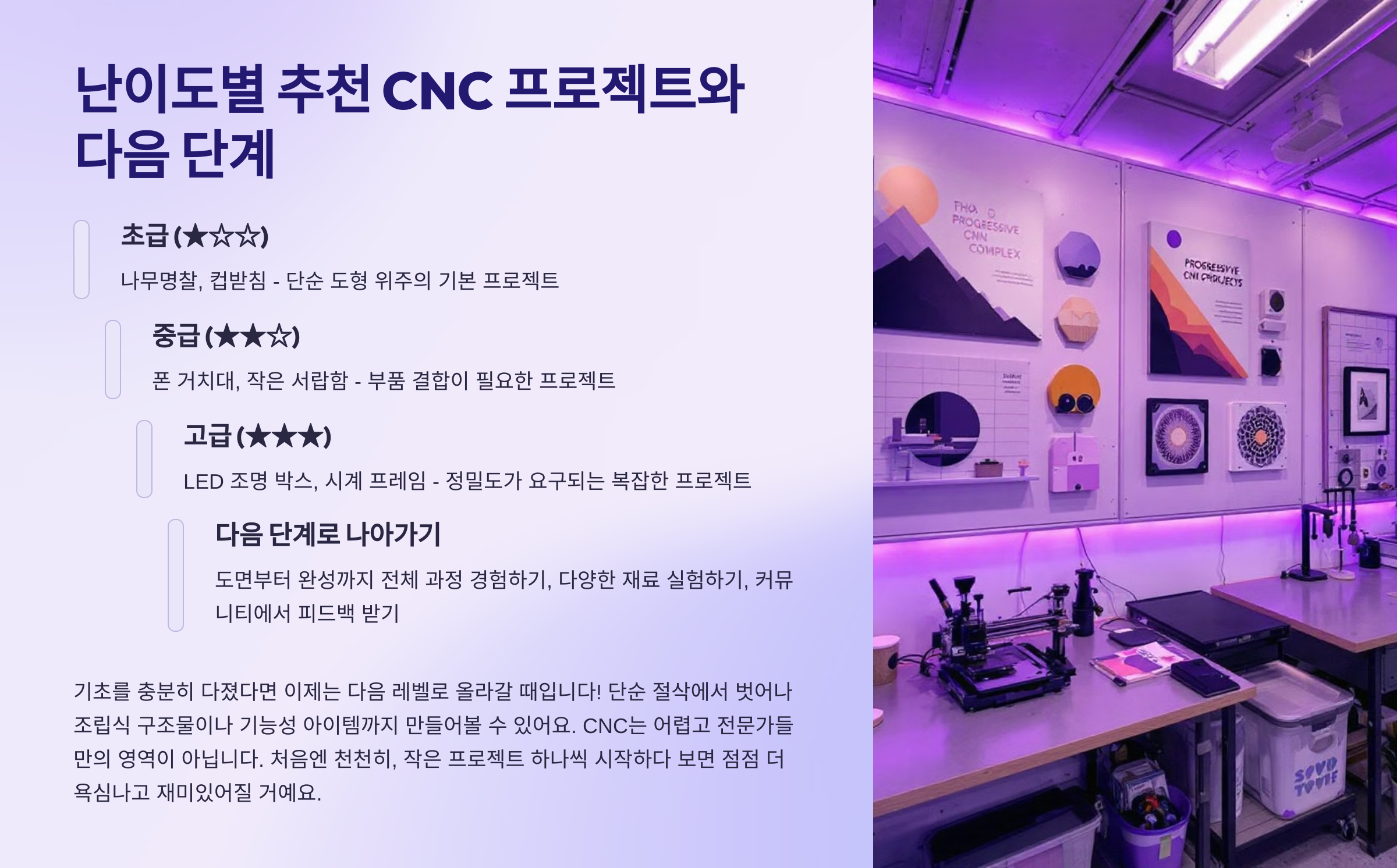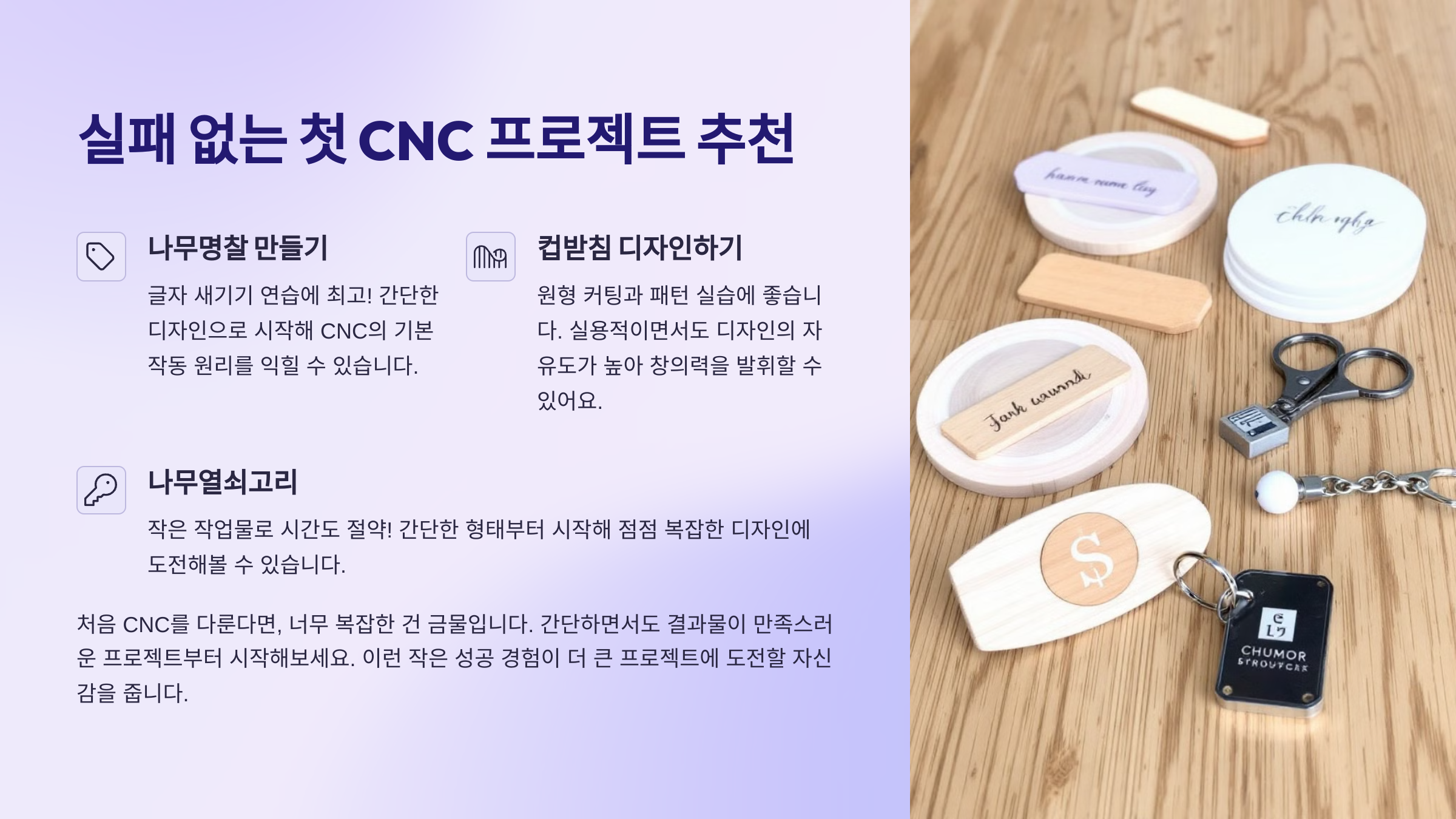 처음 CNC를 다룬다면, 너무 복잡한 건 금물! 간단하면서도 결과물이 만족스러운 프로젝트부터 시작해보세요. 다음은 제가 실제로 시도해보고 추천하는 아이템들이에요: