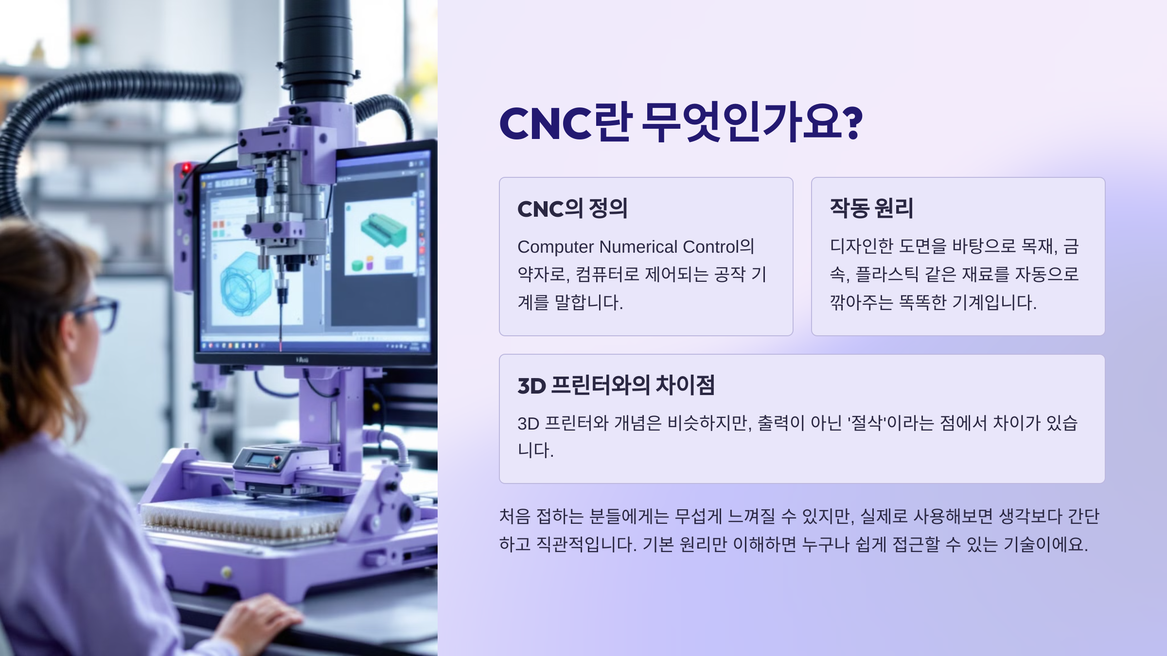 CNC는 Computer Numerical Control의 약자로, 컴퓨터로 제어되는 공작 기계를 말해요. 쉽게 말해서, 여러분이 디자인한 도면을 바탕으로 목재, 금속, 플라스틱 같은 재료를 자동으로 깎아주는 똑똑한 기계죠. 저처럼 처음 접하는 분들은 무섭게 느껴질 수도 있지만, 실제로 사용해보면 생각보다 간단하고 직관적이에요. 우리가 평소에 쓰는 3D 프린터와 개념은 비슷하답니다. 다만 출력이 아니라 ‘절삭’이라는 점에서 차이가 있어요.