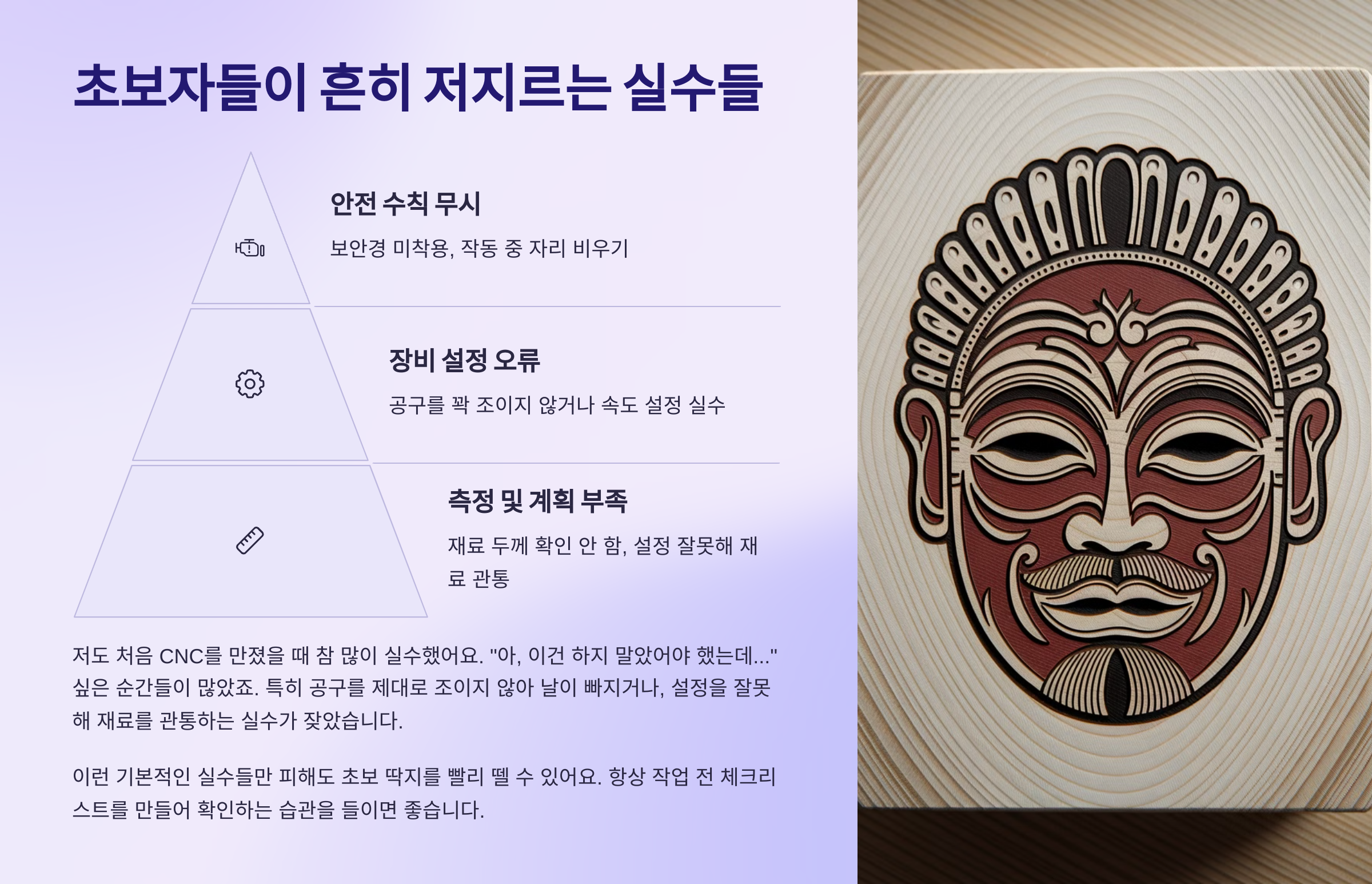 저도 처음 CNC를 만졌을 때 참 많이도 실수했어요. "아, 이건 하지 말았어야 했는데..." 싶은 것들 말이죠. 특히 이런 실수들이 많았어요. 공구를 꽉 조이지 않아서 날이 빠지거나, 설정을 잘못해서 재료를 관통하거나. 다음 실수들만 피해도 초보 딱지를 빨리 뗄 수 있어요.
