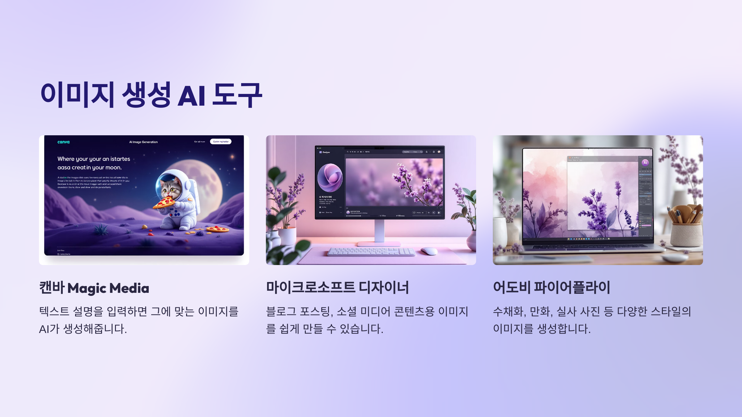 텍스트 외에 '이미지 생성' 분야 역시 초보자들이 흥미롭게 AI를 경험할 수 있는 영역입니다. 디자인 플랫폼으로 유명한 캔바(Canva)의 'Magic Media' 기능이나 마이크로소프트 디자이너(Microsoft Designer)의 이미지 생성기, 어도비 파이어플라이(Adobe Firefly) 등은 텍스트 설명을 입력하면 그에 맞는 이미지를 AI가 생성해주는 기능을 제공합니다. 예를 들어 "우주복을 입고 달에서 피자를 먹는 고양이" 와 같이 상상하는 장면을 텍스트로 묘사하면, 몇 초 안에 해당 이미지를 얻을 수 있습니다. 복잡한 그림판 도구를 다룰 필요 없이, 원하는 이미지를 말로 설명하기만 하면 됩니다. 블로그 포스팅에 필요한 삽화, 소셜 미디어 콘텐츠용 이미지, 프레젠테이션 시각 자료 등을 빠르고 쉽게 만들 수 있다는 장점이 있습니다. 처음에는 간단한 키워드 조합으로 시작하여 점차 스타일(예: 수채화 스타일, 만화 스타일, 실사 사진 스타일)이나 구체적인 요소를 추가하며 원하는 결과물에 가깝게 만들어가는 재미를 느낄 수 있습니다. 이러한 도구들은 시각적인 결과물을 즉각적으로 보여주기 때문에 초보자들이 AI의 창작 능력을 직관적으로 이해하고 활용하는 데 큰 도움이 됩니다.
