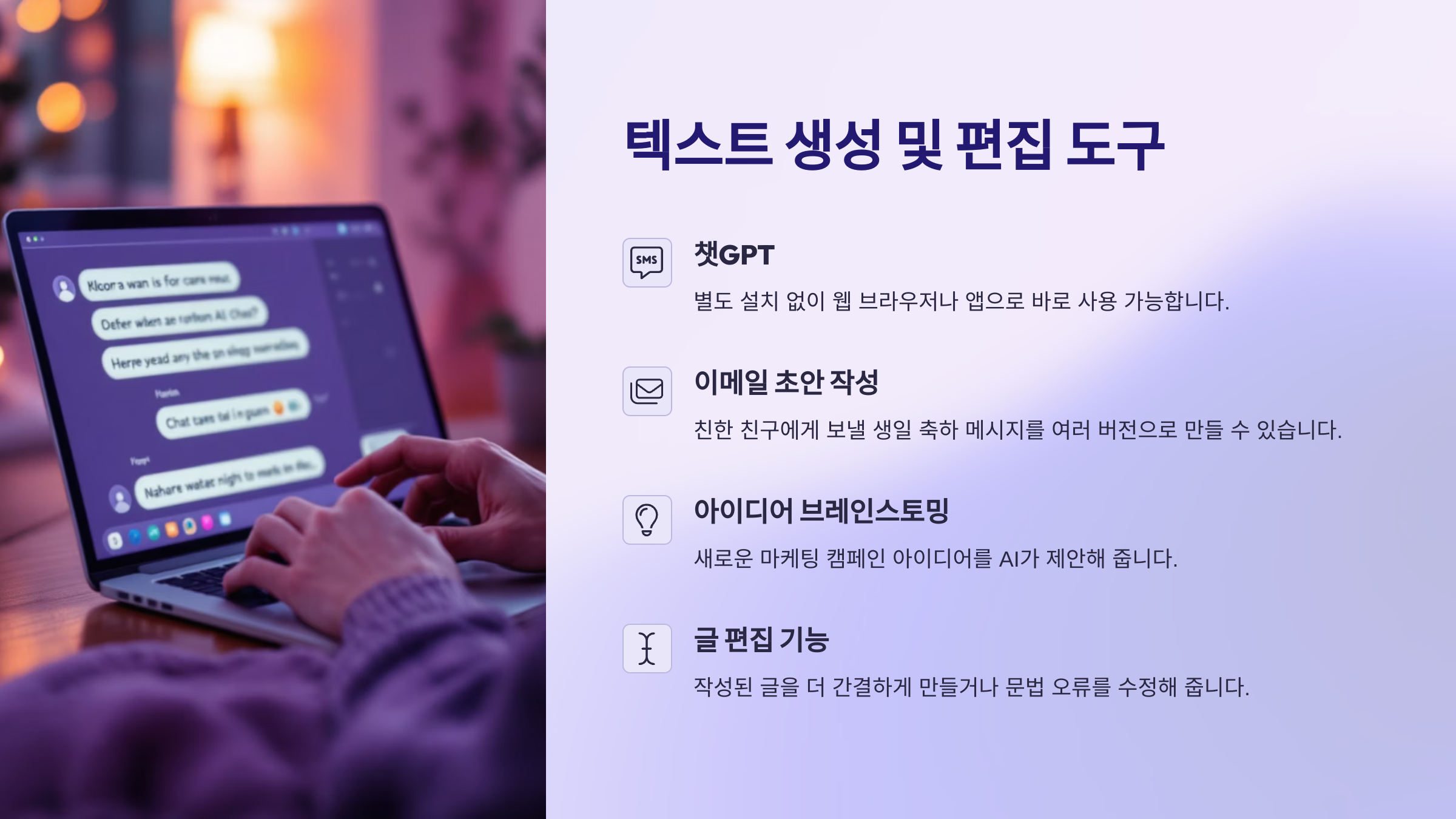 초보자가 가장 쉽게 접근하고 즉각적인 도움을 받을 수 있는 AI 소프트웨어 분야는 단연 '텍스트 생성 및 편집' 도구입니다. 대표적으로 챗GPT(ChatGPT)나 구글 제미나이(Gemini)와 같은 대화형 AI 챗봇은 별도의 설치 없이 웹 브라우저나 앱을 통해 바로 사용할 수 있습니다. 간단한 질문을 입력하거나 원하는 작업(예: 이메일 초안 작성, 아이디어 브레인스토밍, 긴 글 요약)을 지시하면 자연스러운 문장으로 결과를 생성해 줍니다. 예를 들어, "친한 친구에게 보낼 생일 축하 메시지 3가지 버전으로 써줘" 또는 "새로운 마케팅 캠페인 아이디어 5가지 제안해줘" 와 같이 구체적인 요구사항을 전달하면 됩니다. 또한, 이미 작성된 글을 입력하고 "이 글을 더 간결하게 만들어줘" 또는 "문법 오류를 수정해줘" 와 같이 편집을 요청할 수도 있습니다. 이러한 도구들은 복잡한 기능 설정 없이 대화하듯 사용할 수 있어, 글쓰기에 어려움을 느끼거나 아이디어가 필요한 초보자에게 즉각적인 도움을 줄 수 있습니다. 시작은 간단한 질문부터, 점차 다양한 프롬프트(지시어)를 시도하며 AI의 활용 범위를 넓혀가는 것이 좋습니다.