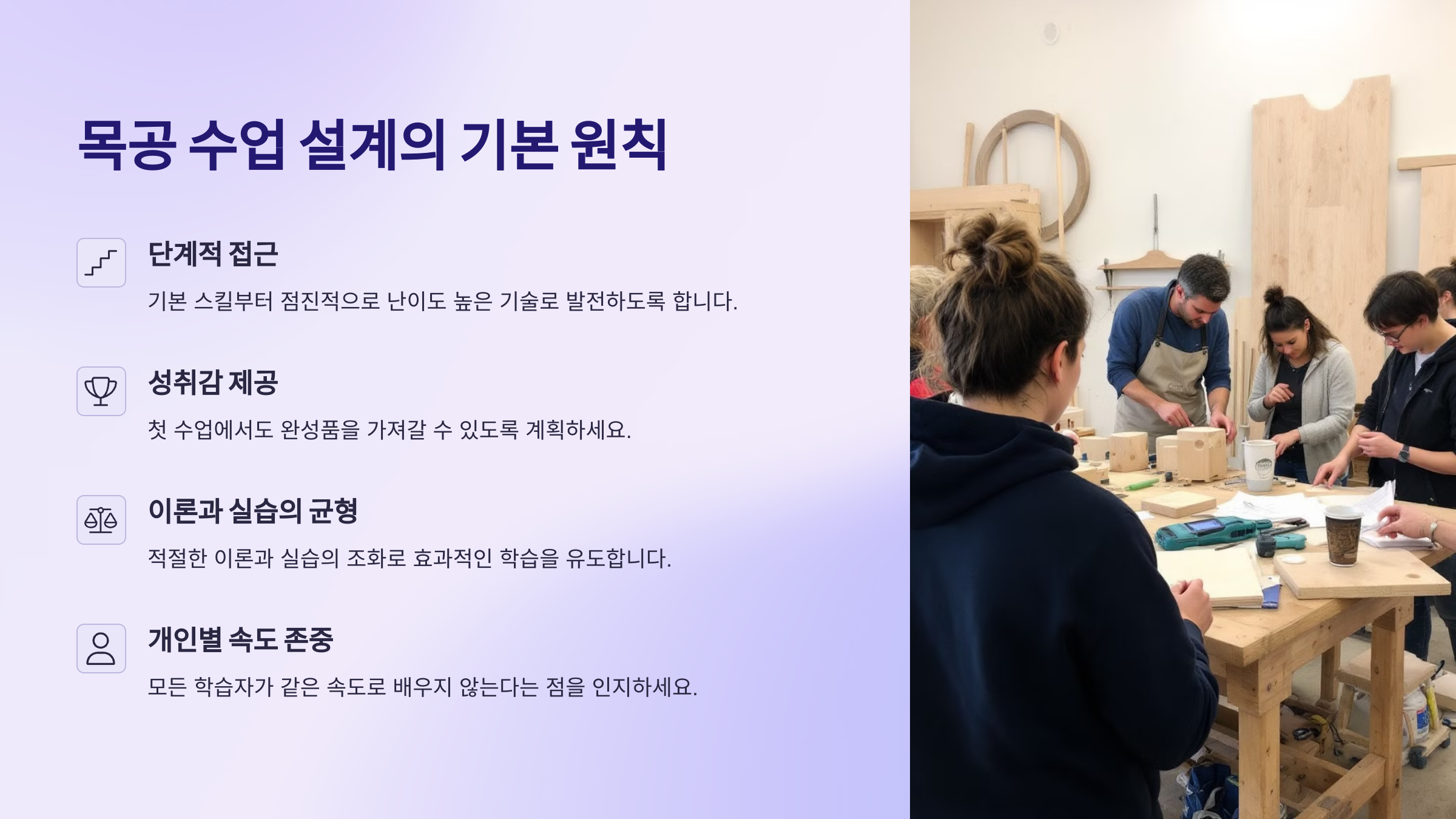 목공 수업을 설계할 때는 단순히 기술만 가르치는 것이 아니라, 학습자들이 성취감을 느끼고 자신감을 얻을 수 있도록 구성하는 것이 중요합니다. 초보자 목공 수업은 다음 원칙을 바탕으로 설계하세요:
