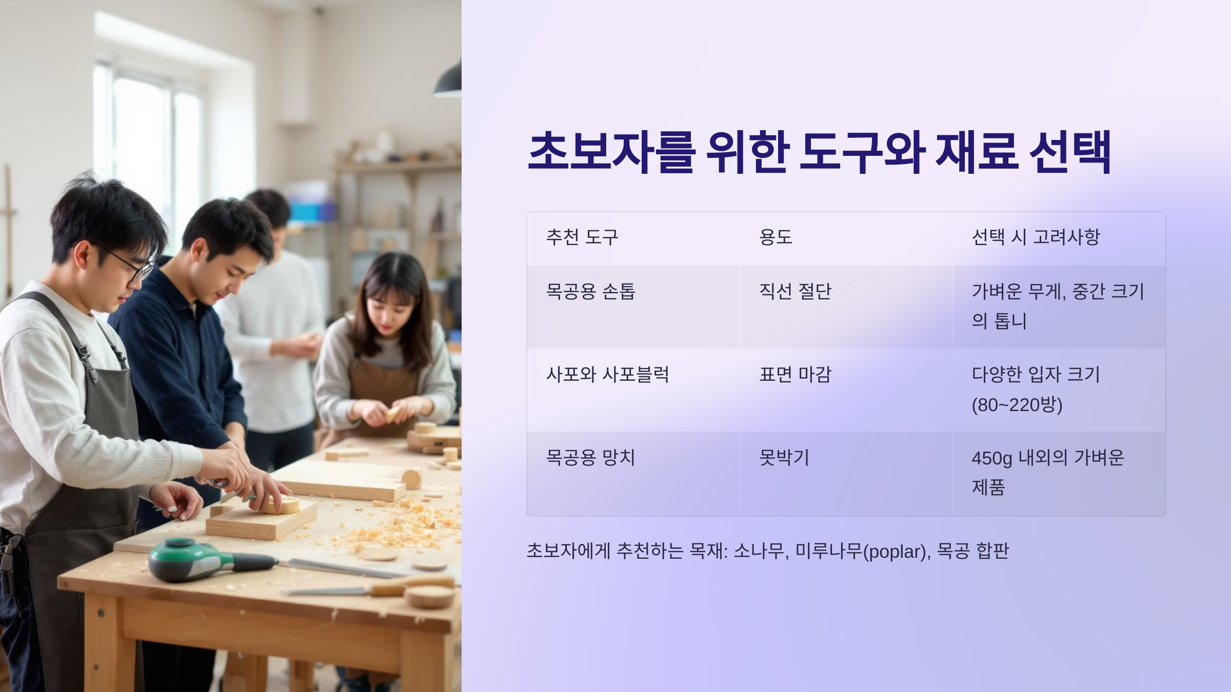 재료 선택도 중요합니다. 초보자에게는 다음과 같은 목재를 추천합니다: