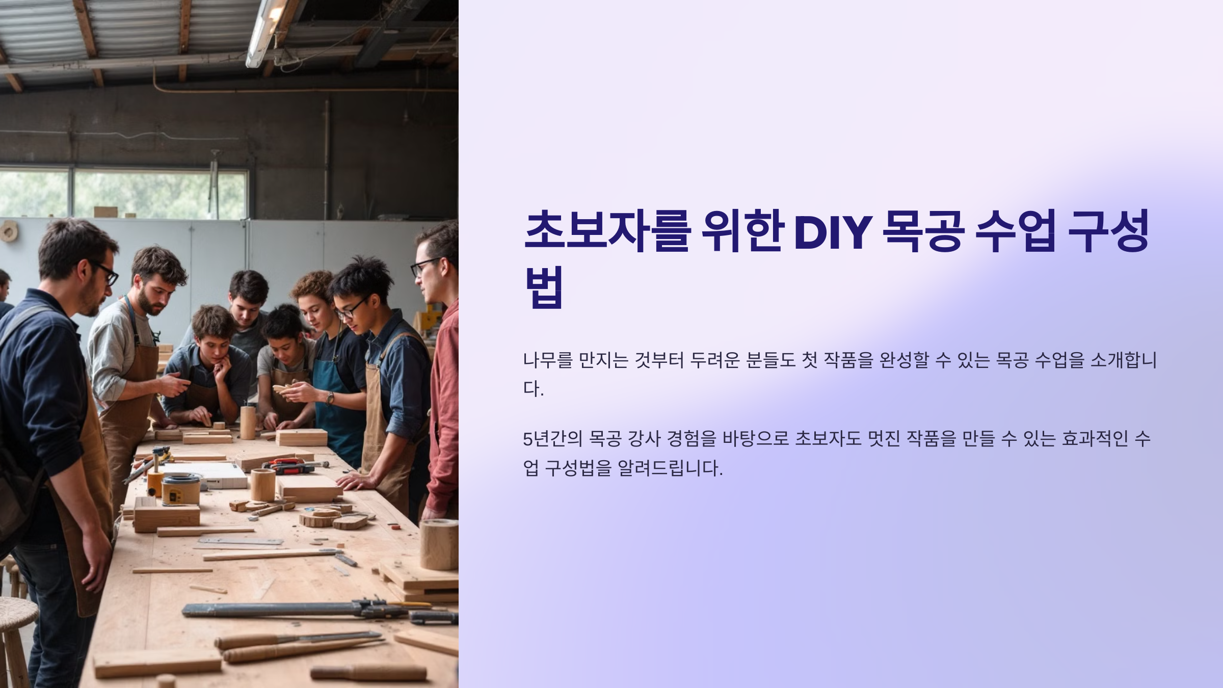 안녕하세요, 여러분. 요즘 집에서 직접 만드는 DIY 문화가 인기를 끌고 있죠. 특히 목공은 실용적인 물건을 만들 수 있어 많은 분들이 관심을 갖지만, 처음 시작하기가 쉽지 않아요. '톱질도 제대로 할 줄 모르는데...'라는 생각에 주저하시는 분들 많으실 거예요. 저도 처음엔 그랬어요. 하지만 5년간 목공 강사로 활동하며 깨달은 것은, 초보자들도 제대로 된 가이드만 있다면 충분히 멋진 작품을 만들 수 있다는 사실입니다. 오늘은 제가 경험을 바탕으로, 초보자들을 위한 목공 수업을 어떻게 구성하면 좋을지 공유해 볼게요. 이 글을 통해 여러분도 효과적인 목공 수업을 기획하실 수 있을 거예요!