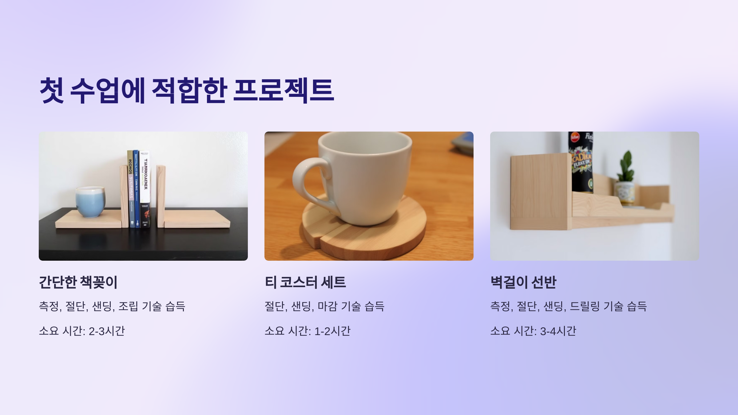 | 간단한 책꽂이 | 측정, 절단, 샌딩, 조립 | 2-3시간 |