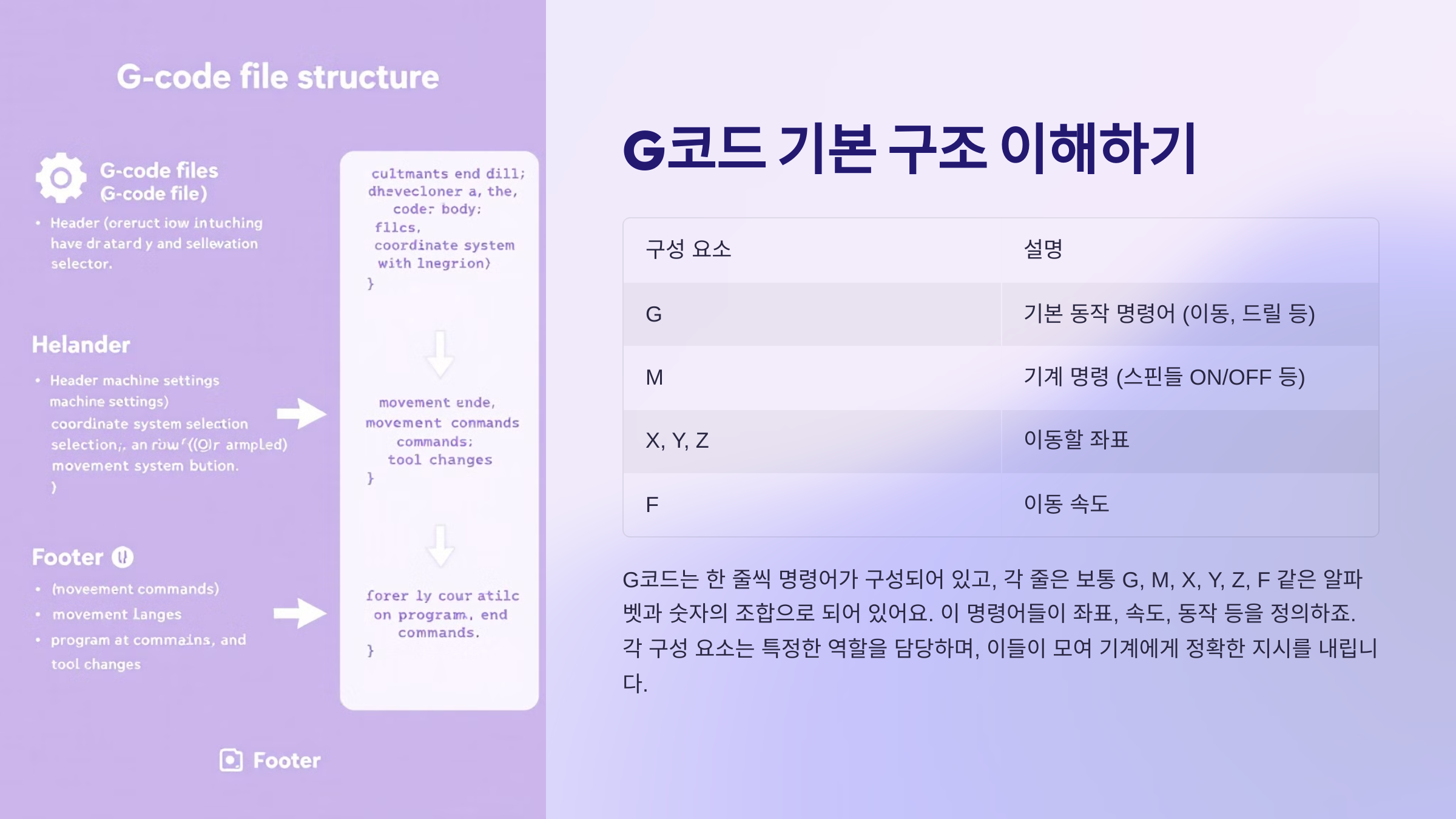 G코드는 한 줄씩 명령어가 구성되어 있고, 각 줄은 보통 G, M, X, Y, Z, F 같은 알파벳과 숫자의 조합으로 되어 있어요. 이 명령어들이 좌표, 속도, 동작 등을 정의하죠. 아래 표는 가장 기본적인 구성 요소들을 설명한 거예요.