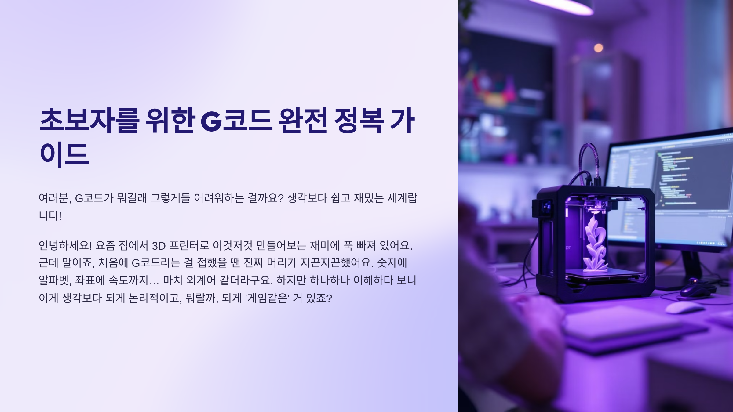 안녕하세요! 요즘 집에서 3D 프린터로 이것저것 만들어보는 재미에 푹 빠져 있어요. 근데 말이죠, 처음에 G코드라는 걸 접했을 땐 진짜 머리가 지끈지끈했어요. 숫자에 알파벳, 좌표에 속도까지… 마치 외계어 같더라구요. 하지만 하나하나 이해하다 보니 이게 생각보다 되게 논리적이고, 뭐랄까, 되게 ‘게임같은’ 거 있죠? 그래서 오늘은 G코드를 처음 접하시는 분들도 쉽게 이해하고 따라할 수 있도록, 저만의 시행착오와 깨달음을 담은 G코드 완전 정복 가이드를 준비했어요!