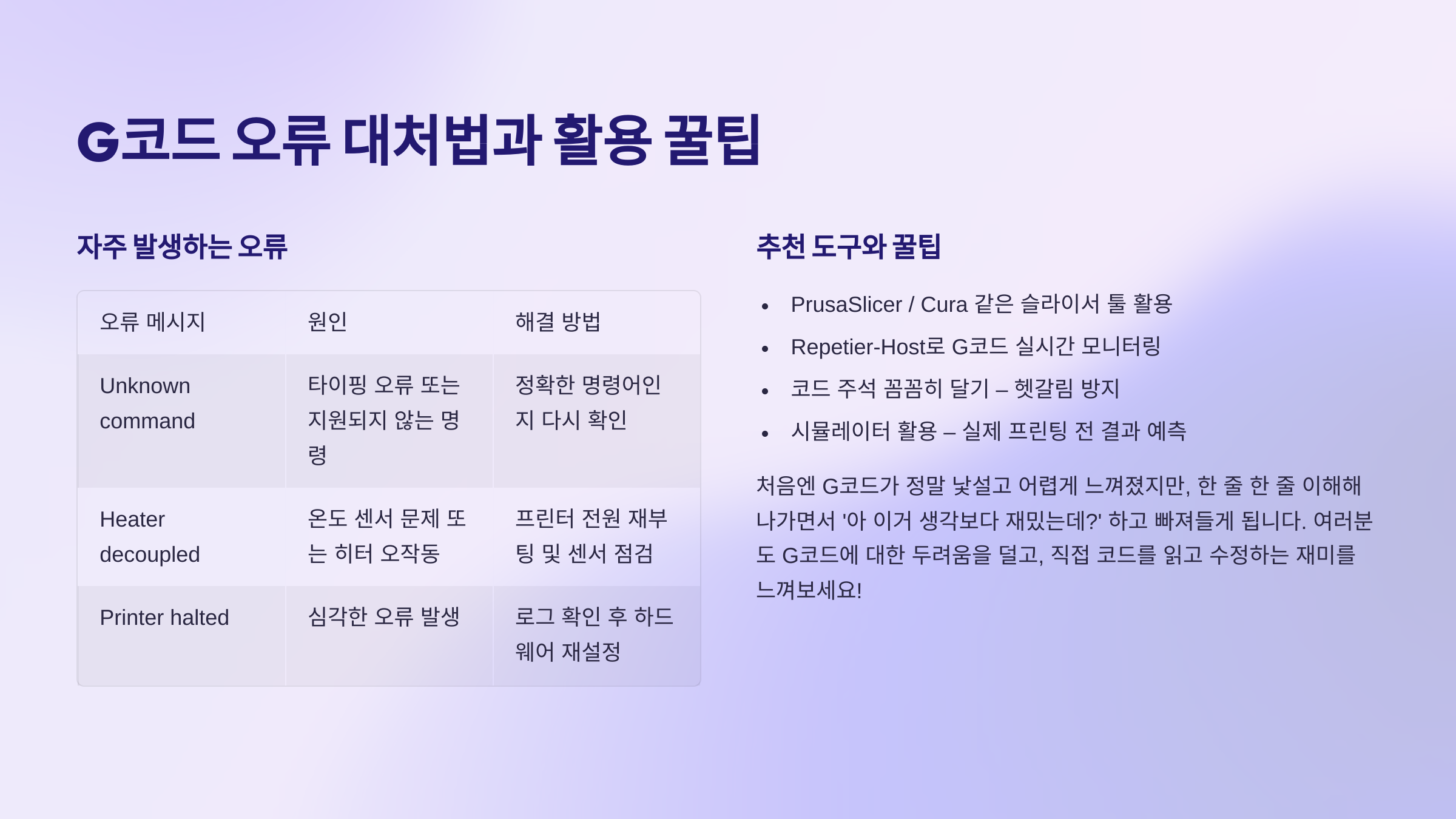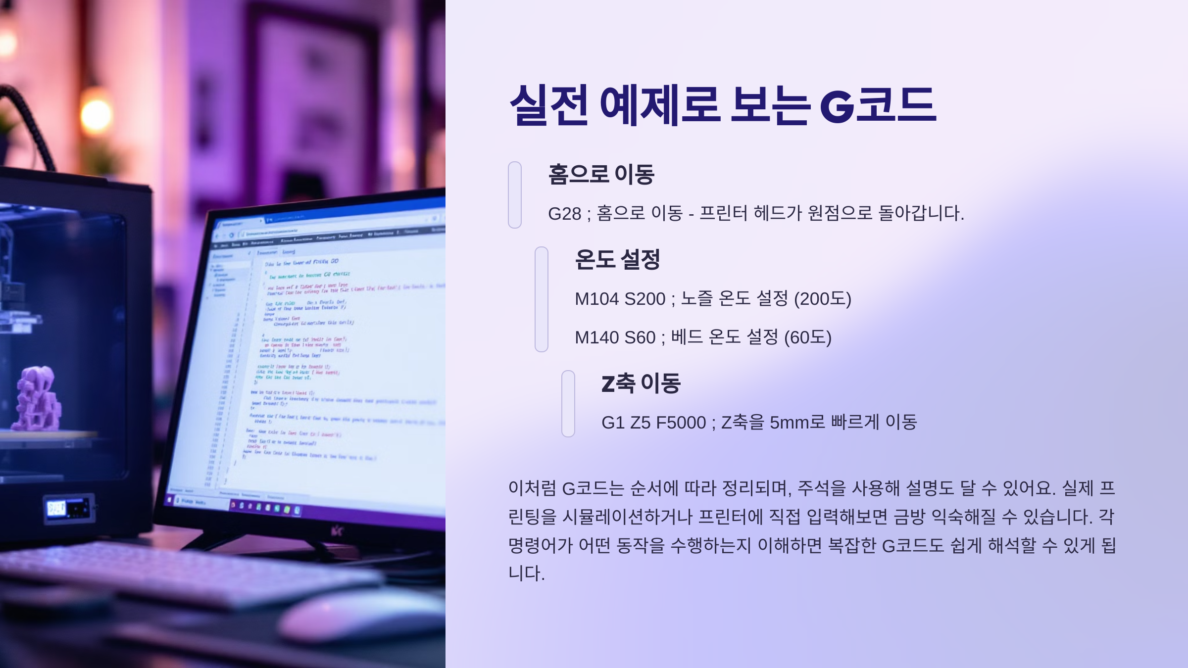 기본 명령어(G, M 시리즈) → 좌표 이동 개념 → 실제 프린팅 시나리오 분석 → 커스터마이징 순으로 접근하면 좋아요.