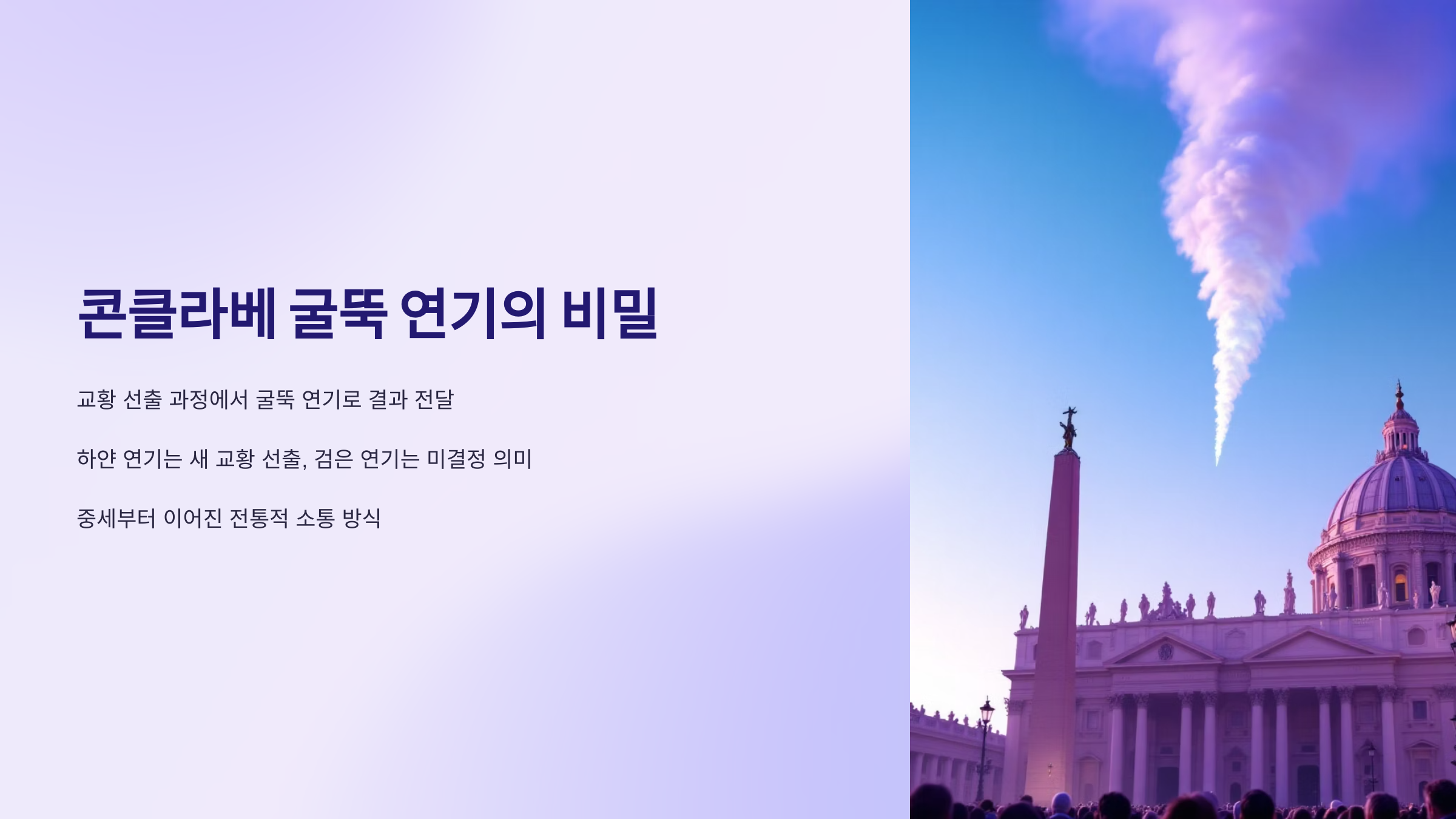 가톨릭 교회의 새로운 교황을 선출하는 비밀회의, '콘클라베(Conclave)'. 전 세계의 이목이 바티칸 시스티나 성당으로 집중되는 이 시기, 가장 상징적인 장면 중 하나는 바로 성당 굴뚝에서 피어오르는 연기입니다. 투표 결과에 따라 하얀 연기 또는 검은 연기가 피어오르며, 이는 외부 세계에 교황 선출 여부를 알리는 유일한 신호가 됩니다. 왜 하필 굴뚝에서 연기를 피우는 방식을 사용할까요? 그리고 하얀 연기와 검은 연기는 각각 어떤 의미를 담고 있으며, 어떻게 만들어지는 것일까요? 이 글에서는 콘클라베 굴뚝 연기의 역사적 배경과 그 안에 담긴 깊은 의미, 그리고 현대적인 작동 방식까지 흥미로운 이야기들을 파헤쳐 보고자 합니다.