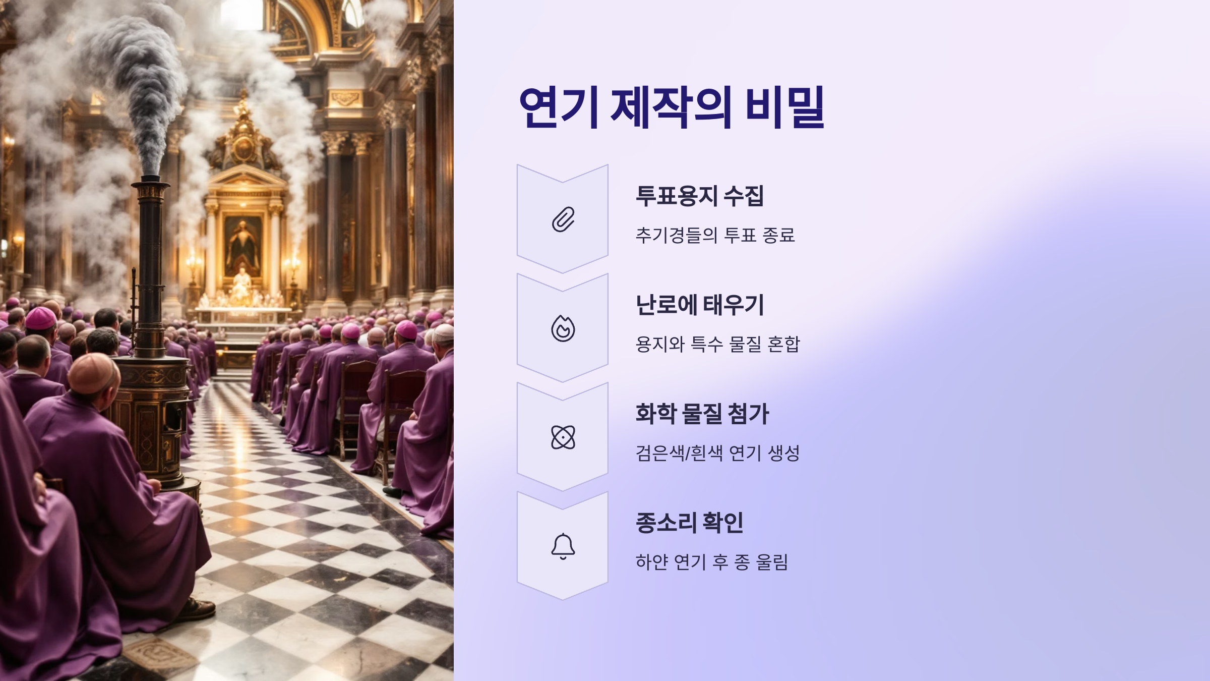 그렇다면 이 상징적인 연기는 정확히 어떻게 만들어지는 것일까요? 전통적으로는 투표용지를 태워서 연기를 발생시킵니다. 추기경들은 각자의 투표용지에 후보의 이름을 적어 투표하고, 투표가 끝나면 이 용지들을 모아 난로에 넣어 태웁니다.