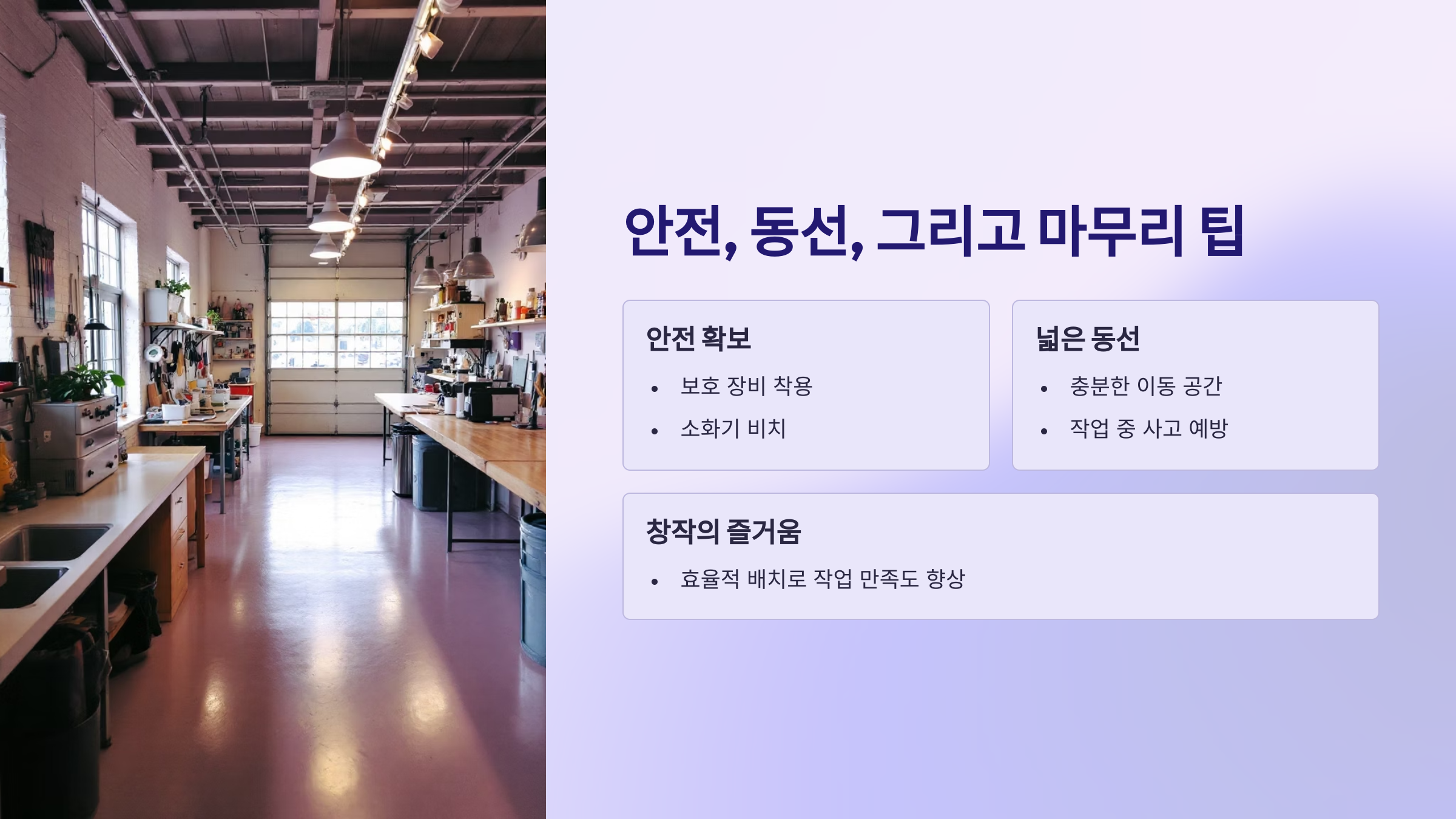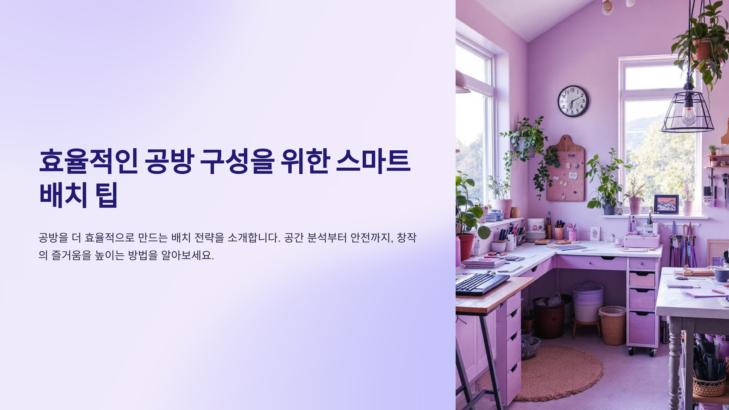 공방은 창작 활동이 이루어지는 중요한 공간입니다. 효율적인 공방 배치는 작업 능률을 높이고, 창작 과정을 더욱 즐겁게 만들어줍니다. 이 글에서는 공간 분석부터 안전 확보까지, 공방 구성을 위한 다양한 팁을 제공합니다.