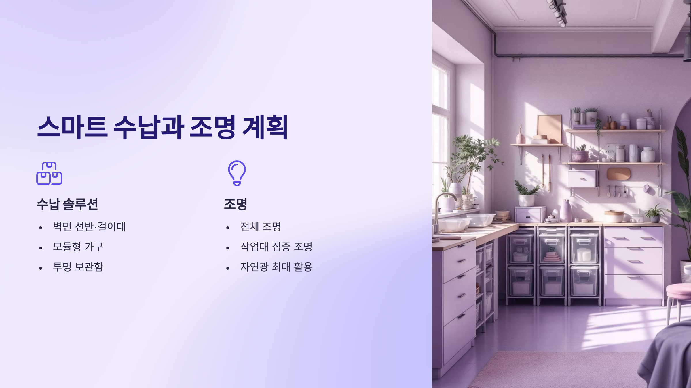 효율적인 수납은 공방 공간 활용의 핵심입니다. 다양한 수납 솔루션을 활용하여 공간을 최대한 활용합니다.