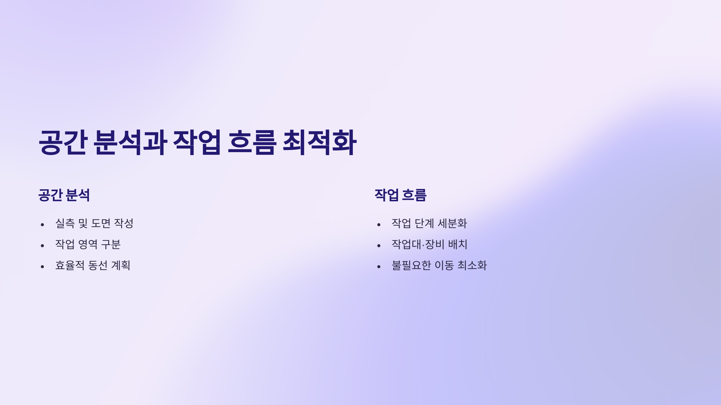 - 동선 계획: 작업 흐름에 따라 효율적인 동선을 계획하고, 불필요한 이동을 최소화합니다.