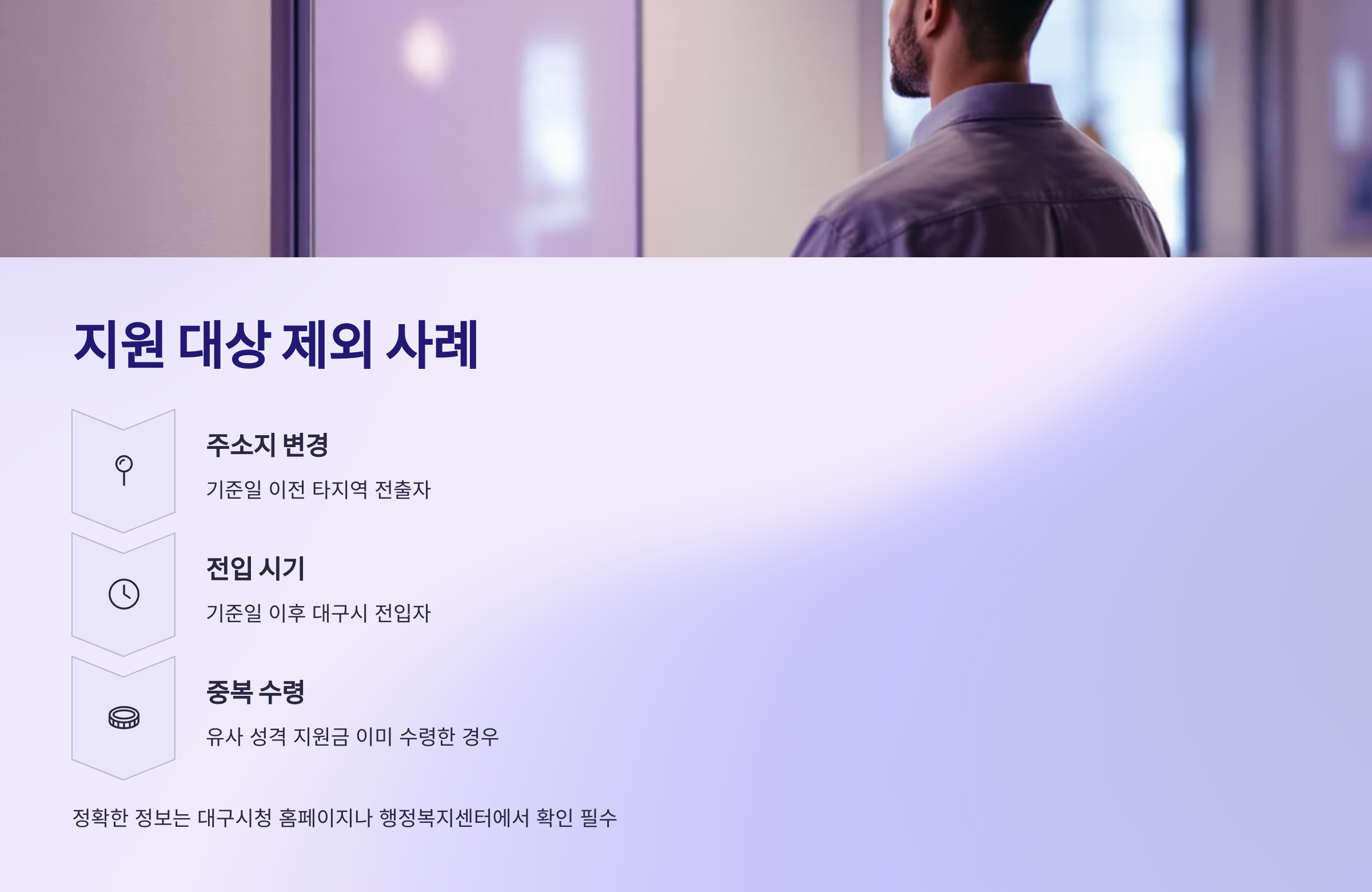 하지만 기준일에 대구시에 주민등록이 되어 있다고 해서 무조건 지원금을 받을 수 있는 것은 아닙니다. 몇 가지 지원 제외 대상 조건도 함께 고려해야 합니다. 가장 대표적인 예외는 기준일 이전에 사망한 경우, 또는 기준일 이전에 다른 시/도로 주소지를 옮겨 대구시민이 아니게 된 경우입니다. 반대로 기준일 이후에 대구시로 전입한 경우에도 해당 지원금의 대상이 되지 않습니다. 간혹 특정 정부 지원금을 이미 받고 있는 경우 등 사업별 세부 지침에 따라 중복 수혜 방지를 위해 제외되는 경우도 있을 수 있습니다. 그렇기 때문에 "나는 당연히 되겠지" 또는 "나는 안 될 거야"라고 미리 단정 짓기보다는, 반드시 대구광역시청 홈페이지나 관련 보도자료를 통해 발표되는 공식 공고문을 확인하는 것이 가장 정확합니다. 공고문에는 정확한 기준일, 지원 대상, 제외 대상, 신청 기간 및 방법, 지급 방식(주로 대구행복페이 등 지역화폐) 등이 상세하게 안내되므로, 꼼꼼히 읽어보고 해당될 경우 기간 내에 신청하여 소중한 혜택을 놓치지 마시기 바랍니다.