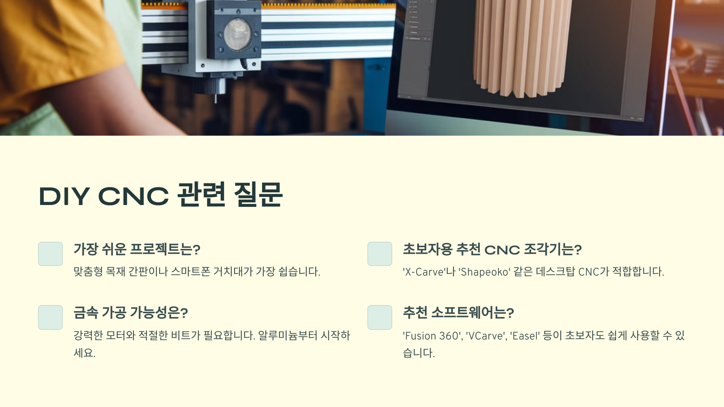👉 'X-Carve'나 'Shapeoko' 같은 데스크탑 CNC가 초보자에게 적합합니다.