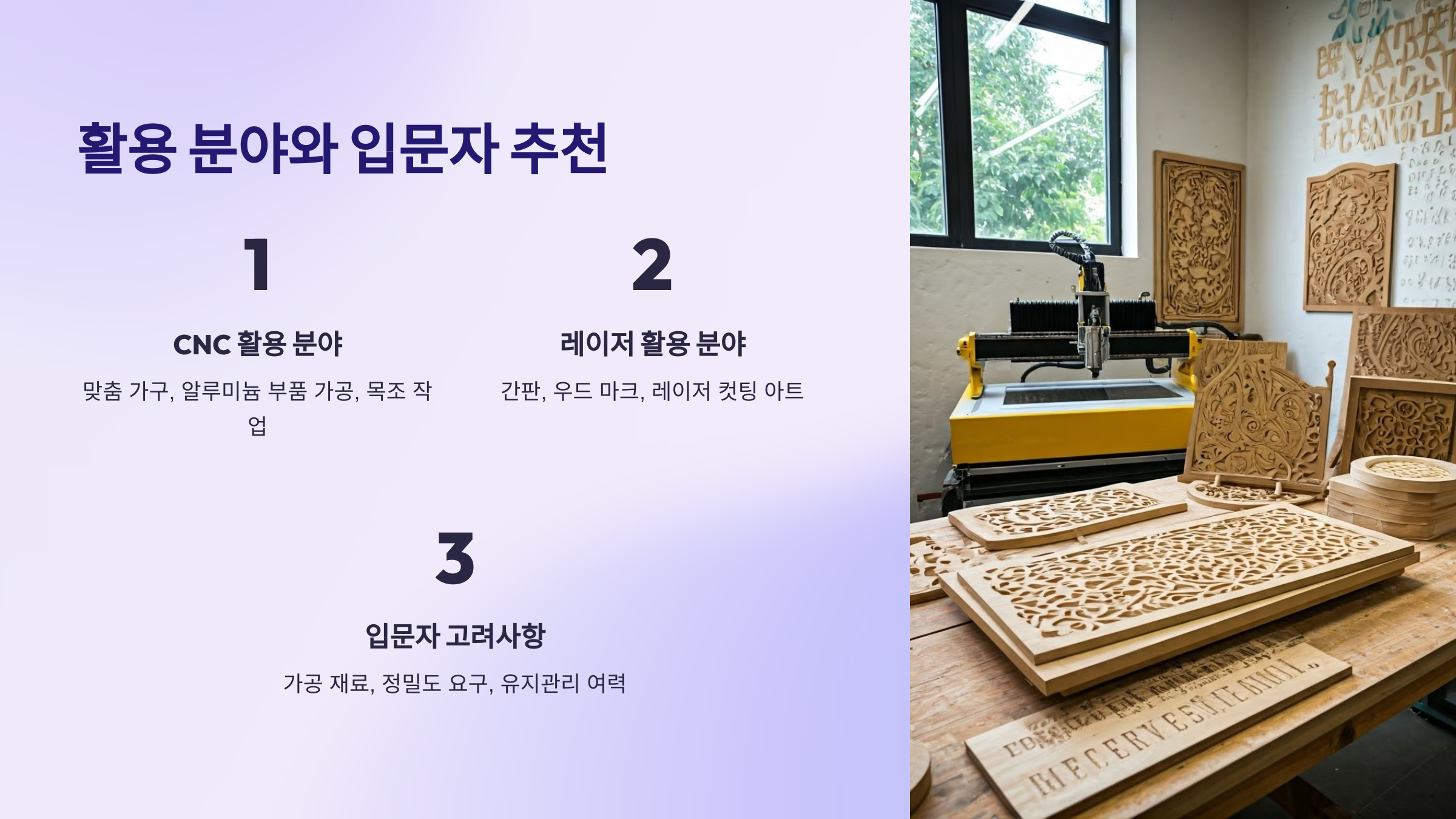 - CNC: 맞춤 가구, 알루미늄 부품 가공, 목조 작업