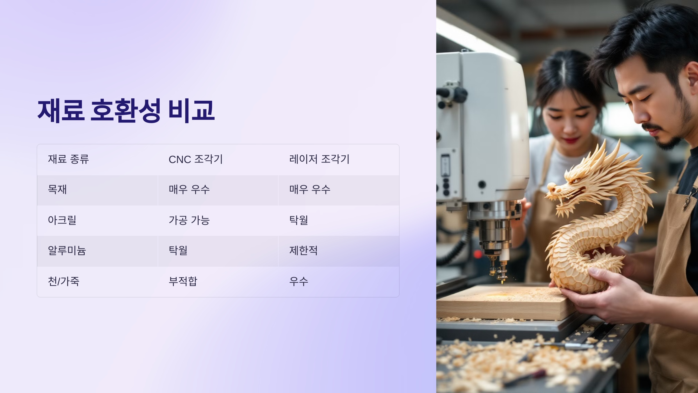 | 재료 종류 | CNC 조각기 | 레이저 조각기 |