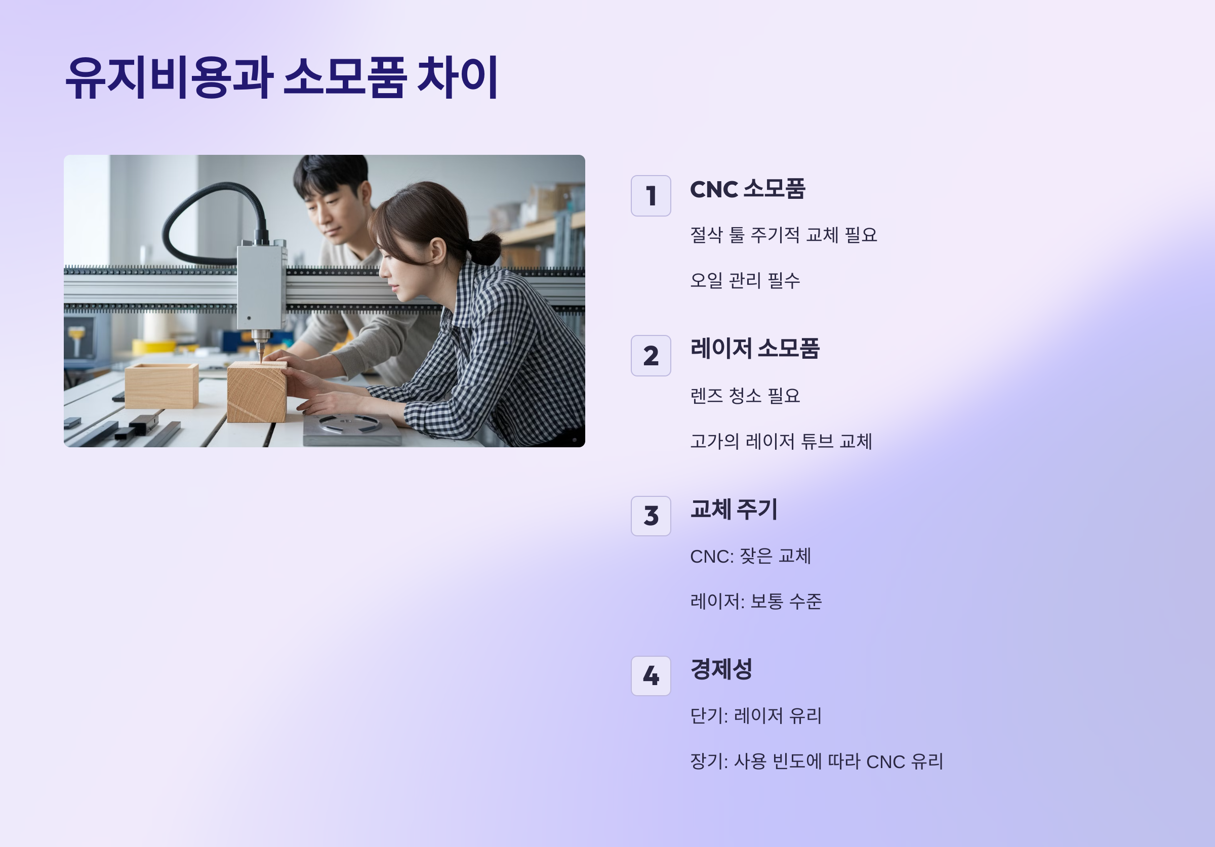 단기적으로는 레이저, 장기적으로는 사용 빈도에 따라 CNC가 더 유리할 수 있어요.
