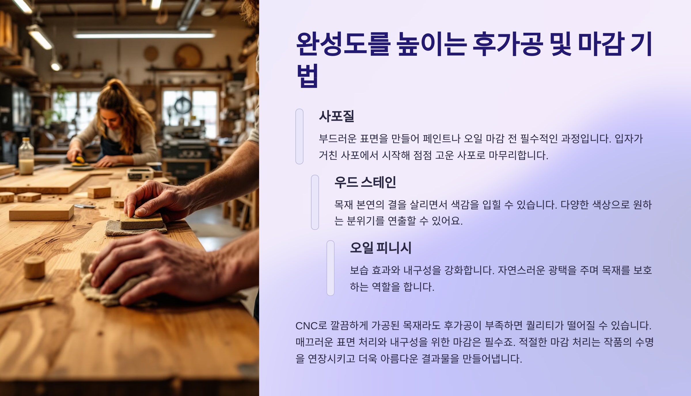 CNC로 깔끔하게 가공된 목재라도 후가공이 부족하면 퀄리티가 떨어질 수 있습니다. 매끄러운 표면 처리와 내구성을 위한 마감은 필수죠.