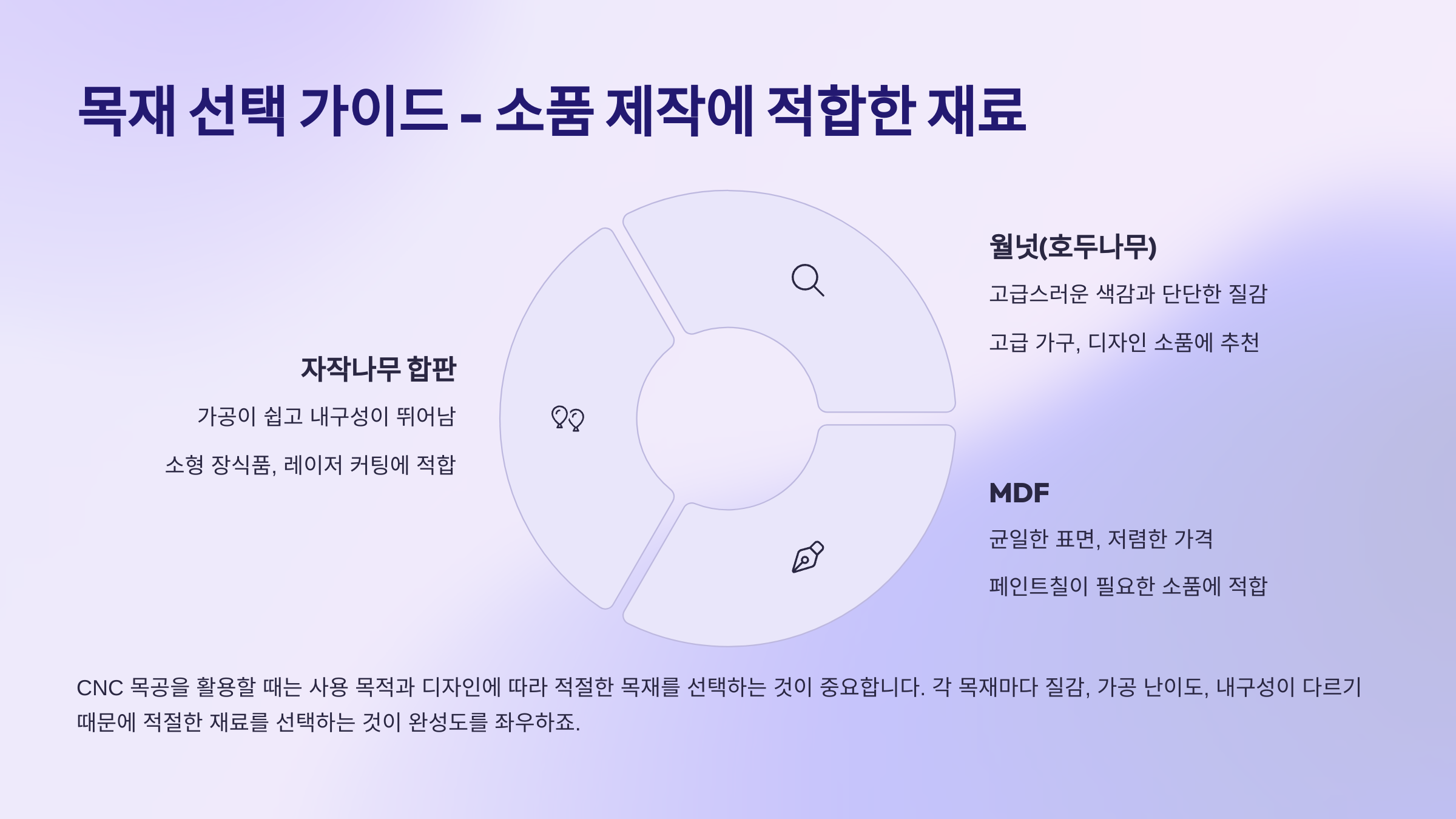 CNC 목공을 활용할 때는 사용 목적과 디자인에 따라 적절한 목재를 선택하는 것이 중요합니다. 각 목재마다 질감, 가공 난이도, 내구성이 다르기 때문에 적절한 재료를 선택하는 것이 완성도를 좌우하죠.