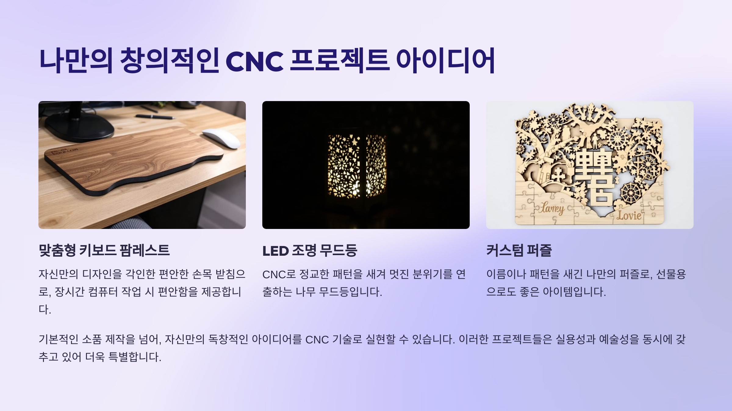 기본적인 소품 제작을 넘어, 자신만의 독창적인 아이디어를 CNC 기술로 실현할 수 있습니다. 다음과 같은 프로젝트를 시도해보세요!
