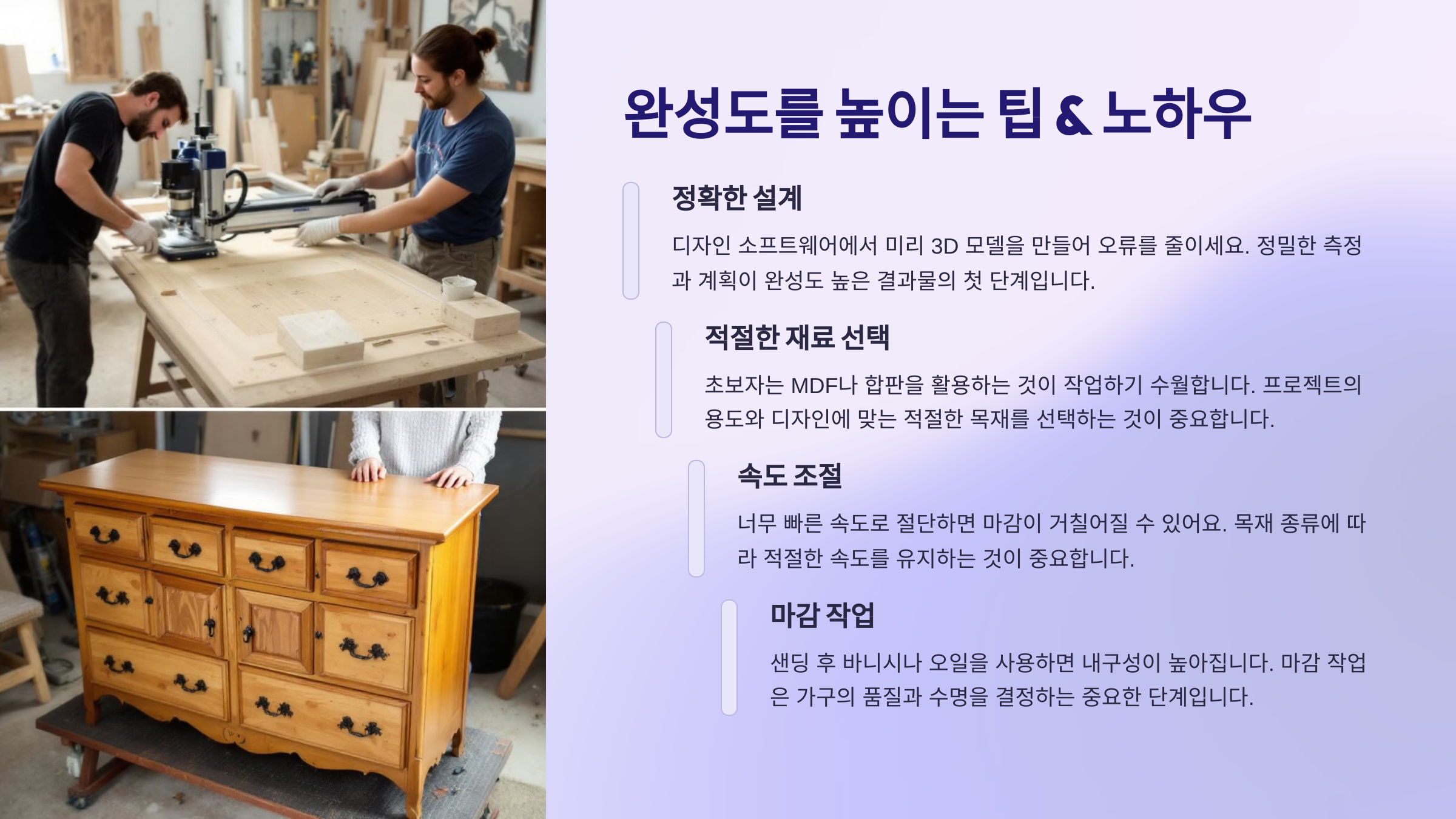 CNC 목공 키트를 활용하여 가구를 만들 때 몇 가지 팁을 알고 있으면 훨씬 완성도 높은 결과물을 얻을 수 있어요.