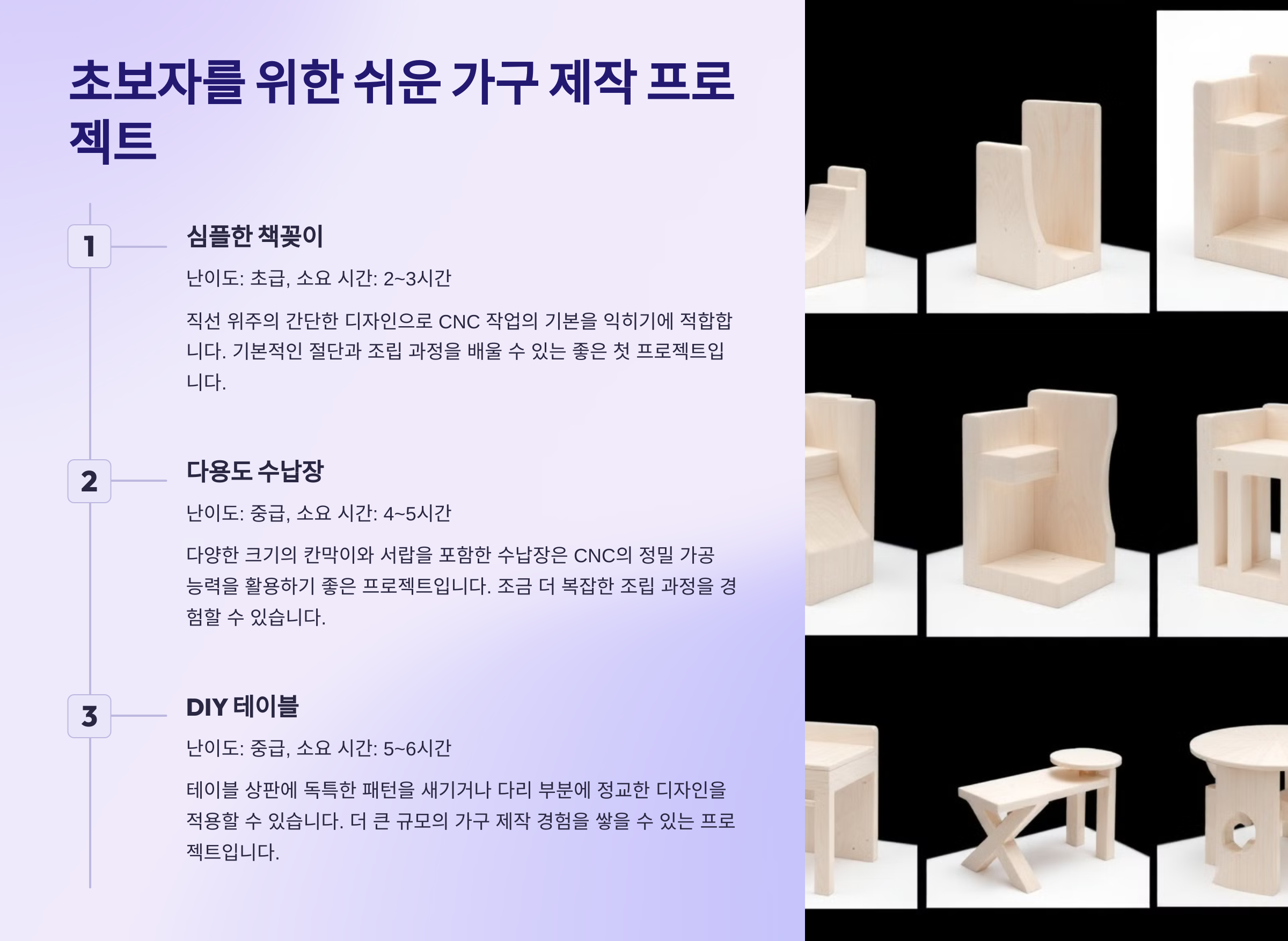 처음 CNC 목공 키트를 활용하여 가구를 만들 때는 너무 복잡한 프로젝트보다 간단한 것부터 시작하는 것이 좋아요. 아래 몇 가지 추천 프로젝트를 소개합니다.