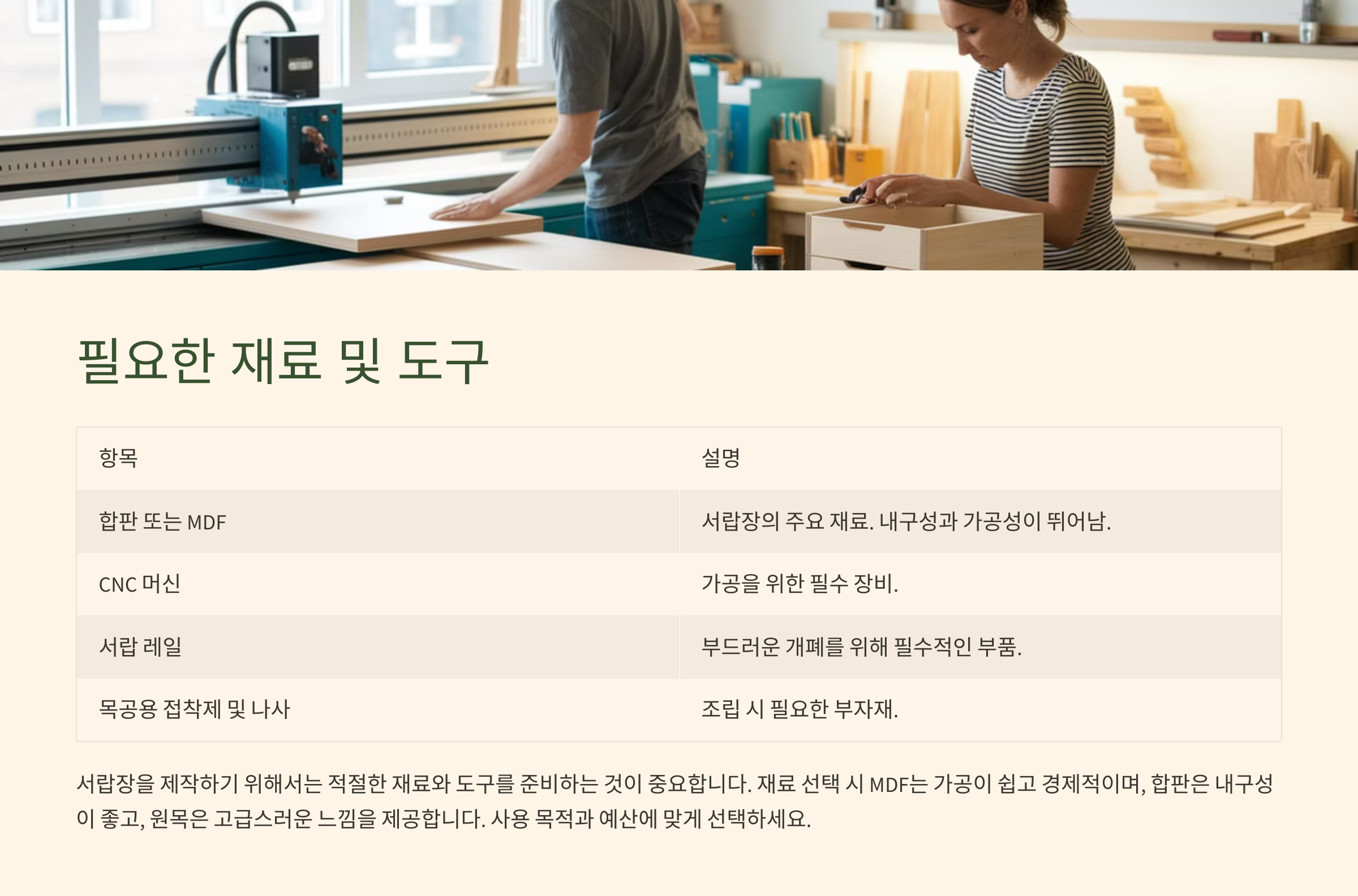 서랍장을 제작하기 위해서는 적절한 재료와 도구를 준비하는 것이 중요합니다. 아래 표는 CNC 서랍장 제작에 필요한 주요 재료와 도구를 정리한 것입니다.