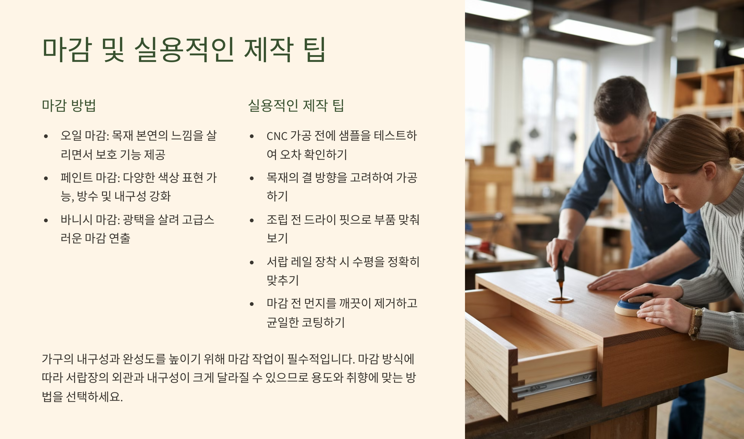 가구의 내구성과 완성도를 높이기 위해 마감 작업이 필수적입니다. 마감 방식에 따라 서랍장의 외관과 내구성이 크게 달라질 수 있습니다.