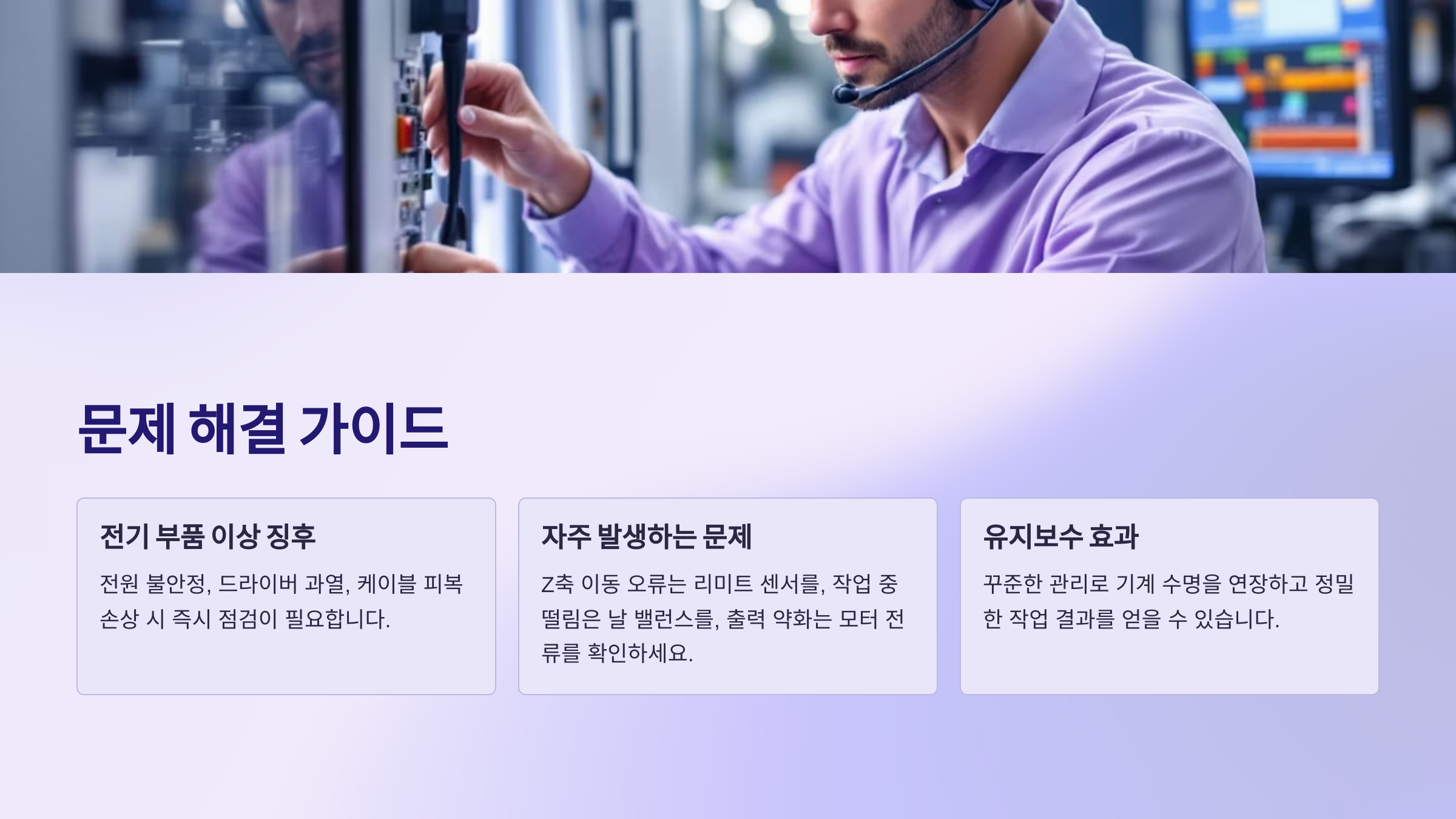Z축 이동 오류, 출력 약화, 진동 발생이 대표적입니다. 원인을 체크하고 필요 시 재조정하거나 정비해야 합니다.