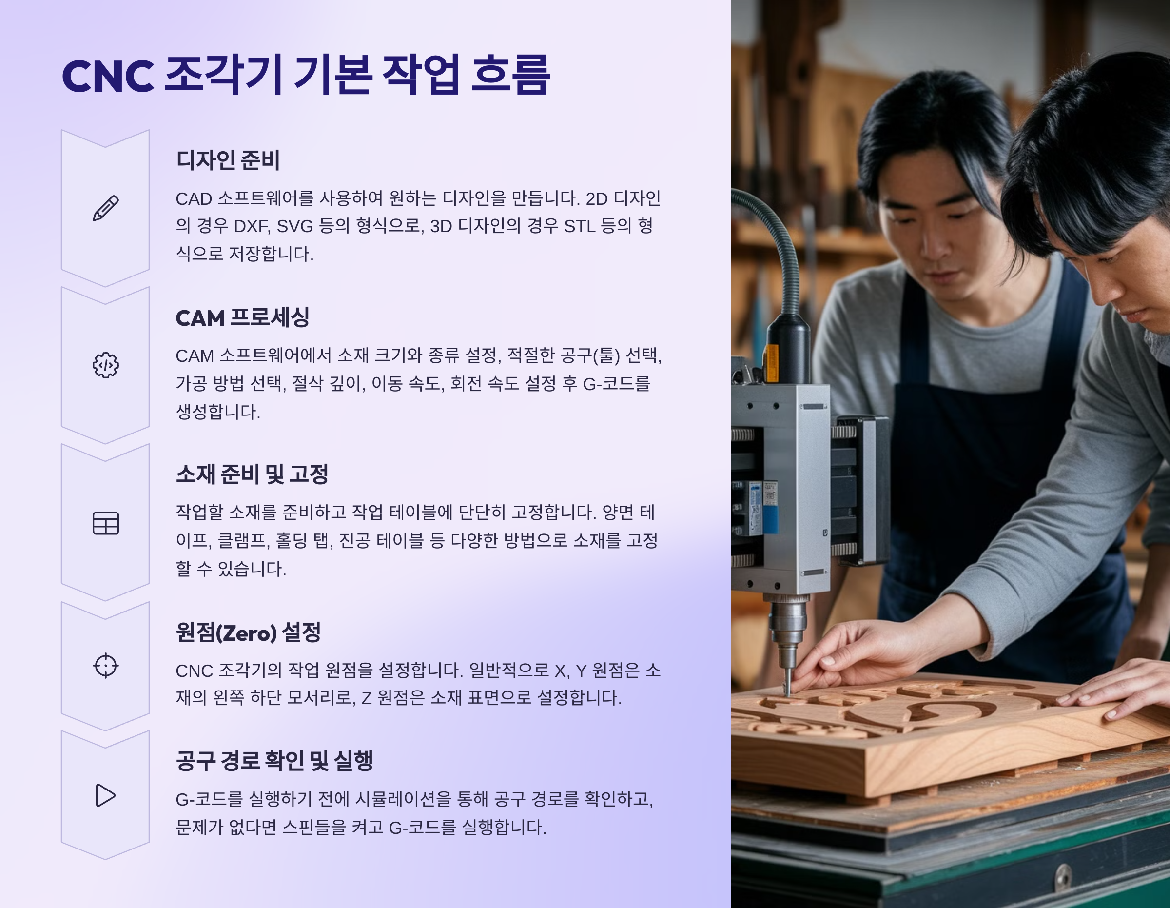 CNC 조각기로 작업하는 기본적인 흐름은 다음과 같습니다: