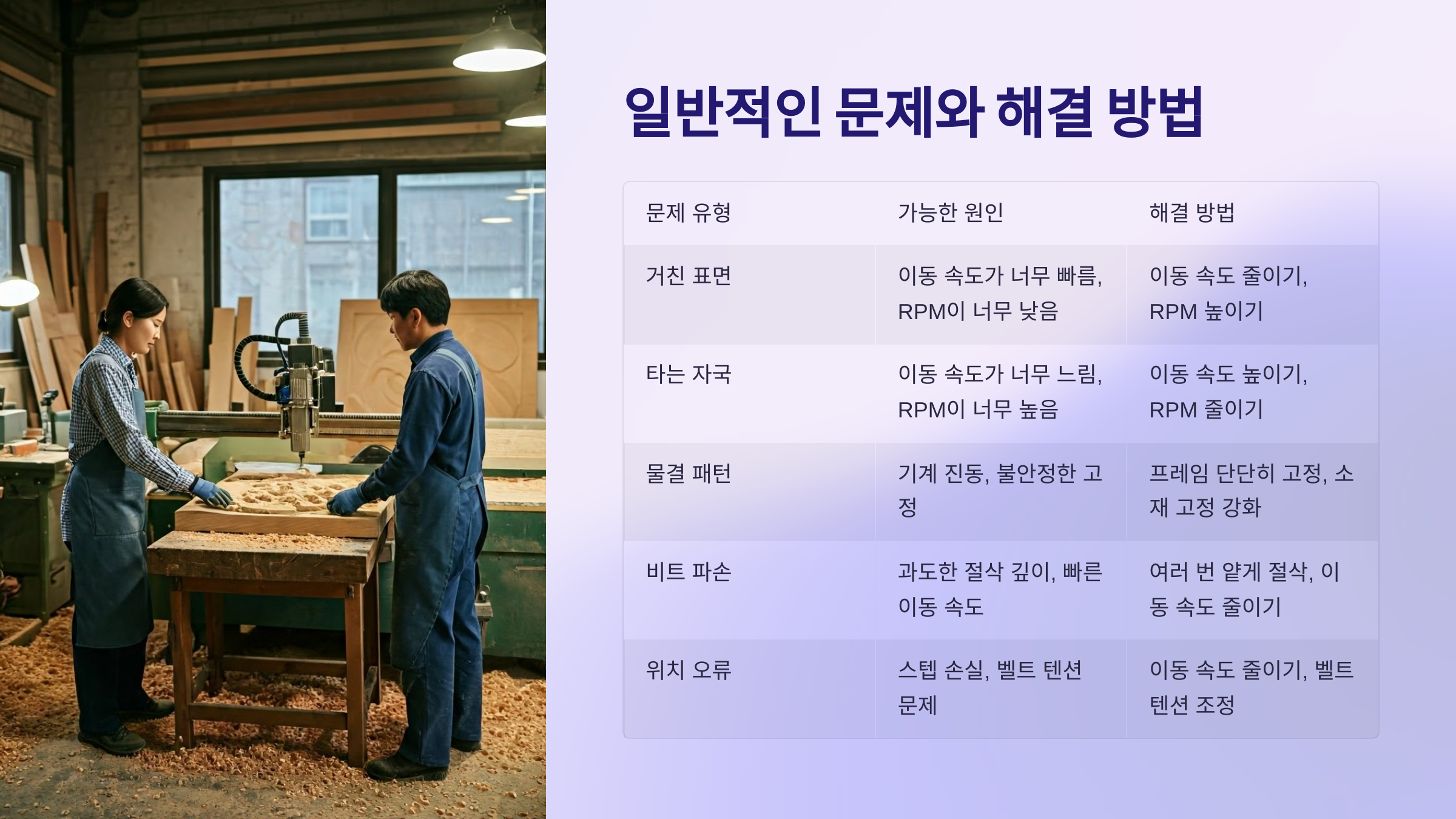 | 비트 파손 | 과도한 절삭 깊이, 빠른 이동 속도 | 여러 번 얕게 절삭, 이동 속도 줄이기 |